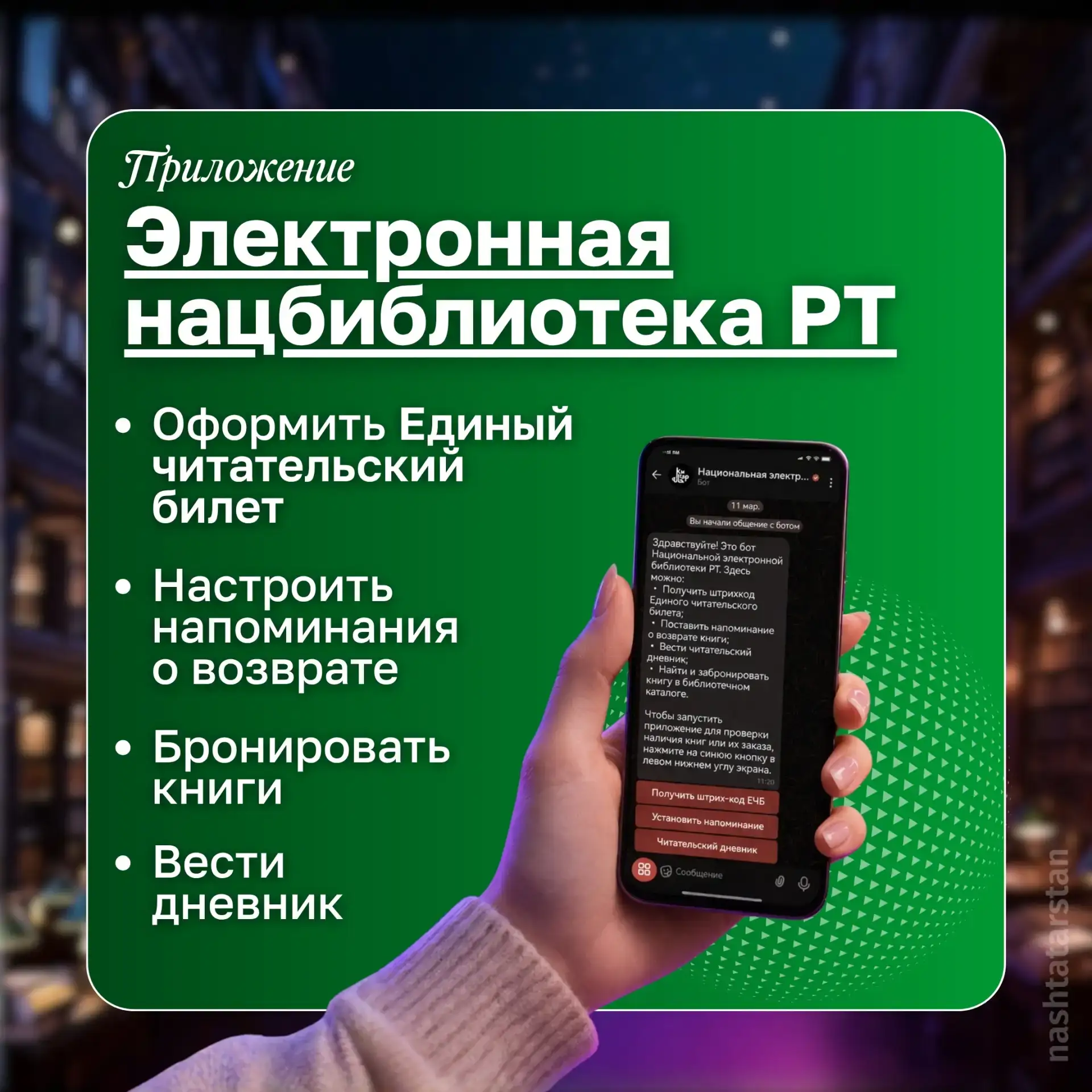 🔹Мини-приложение «Национальная электронная библиотека РТ» позволит удобно оформить читательский билет или выбрать интересную книгу для прочтения.