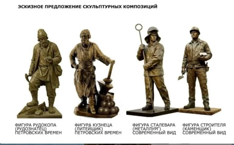 Проект включает две пары фигур: рудознатец и кузнец-литейщик «петровских времён», а также сталевар и строитель как символ современности. Место выбрали неслучайно — здесь находилось ядро старого заводского комплекса.