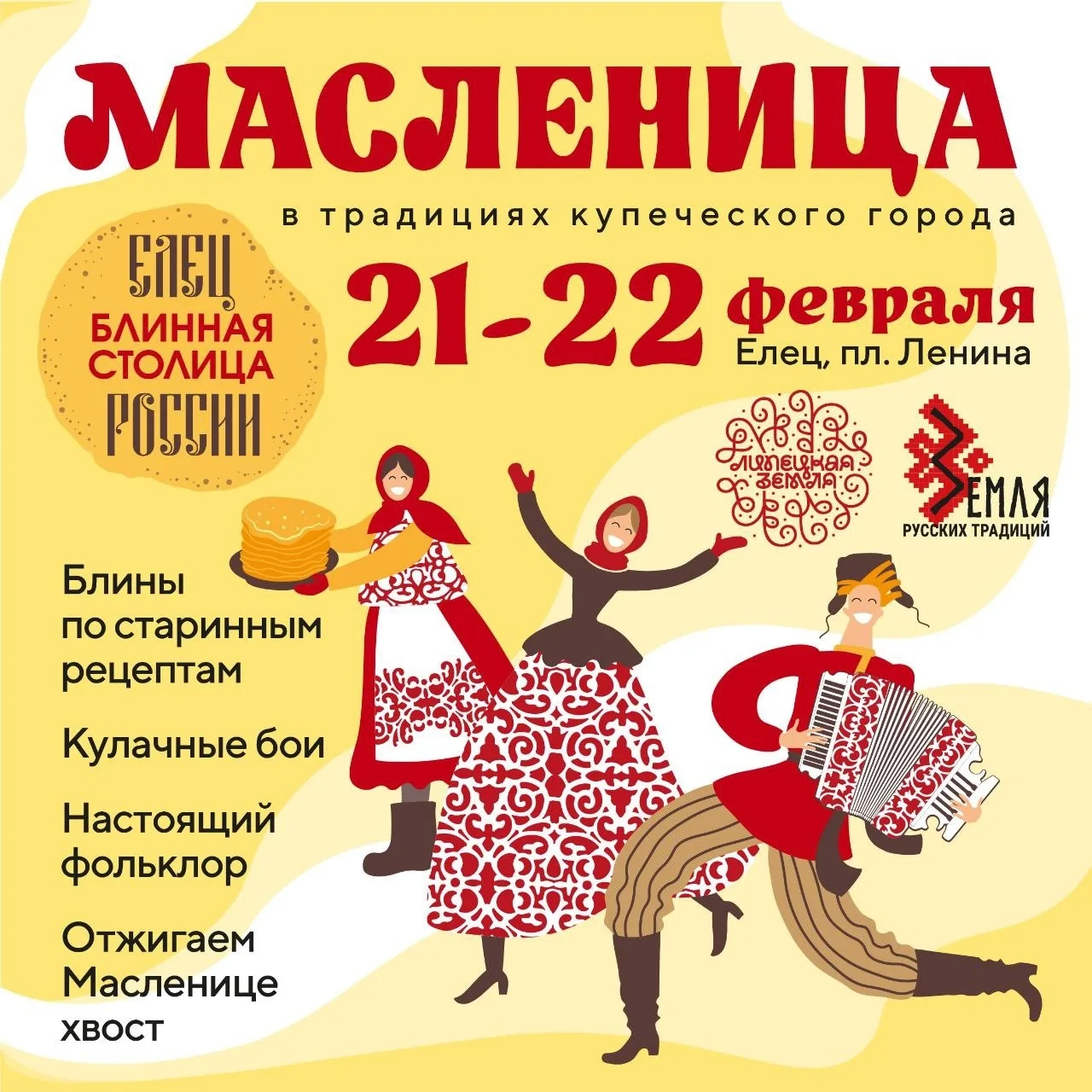21–22 февраля город вновь погрузится в атмосферу XIX века. В историческом центре пройдут народные гуляния, ярмарки и угощения гречневыми блинами по тем самым рецептам, которые когда-то сделали Елец блинной столицей России.