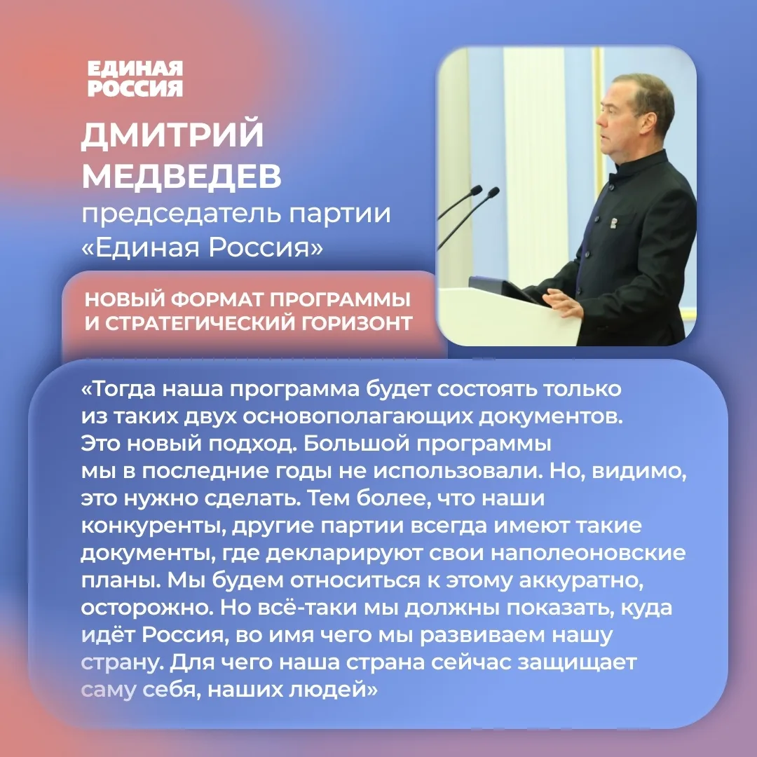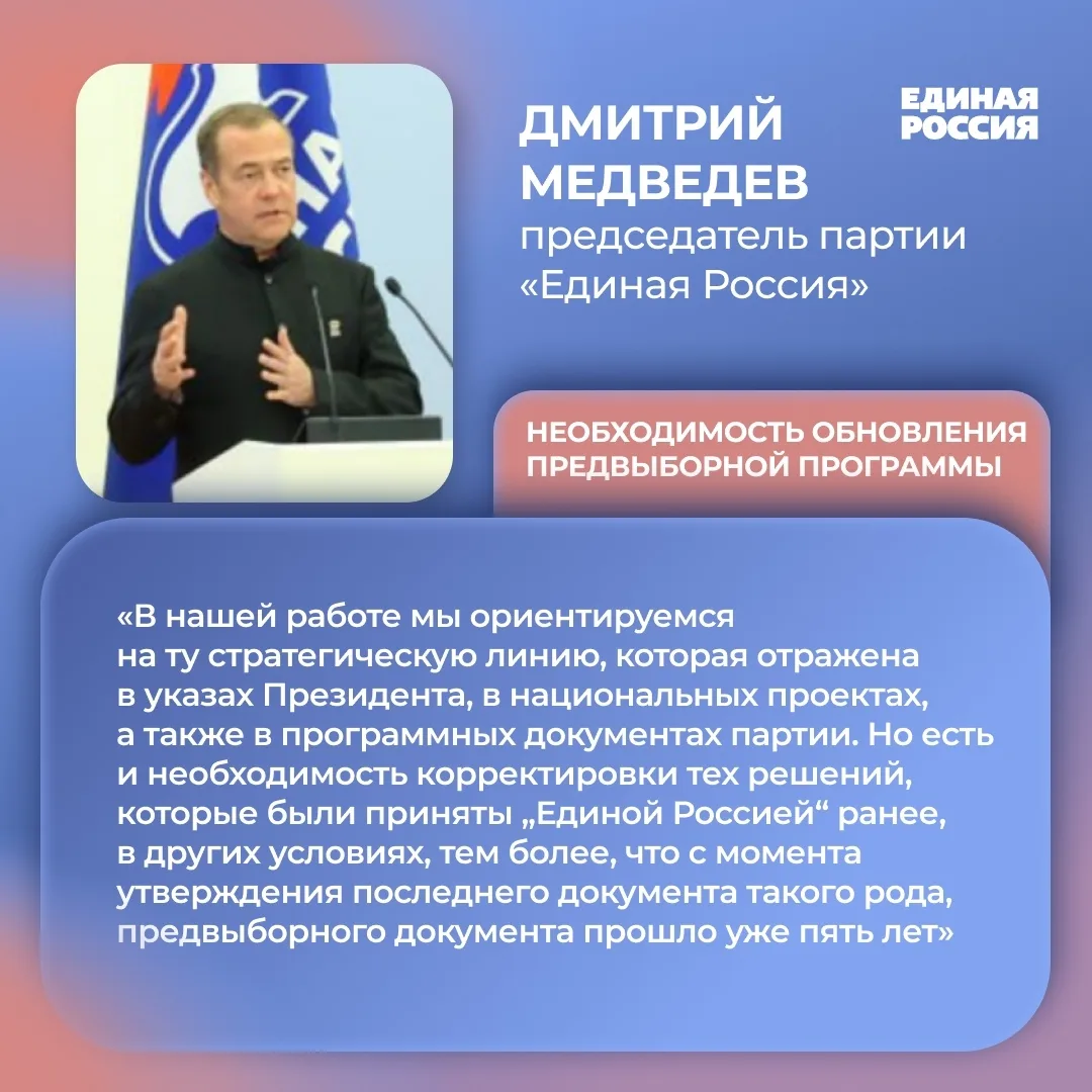 Председатель партии Дмитрий Медведев пригласил экспертное сообщество к работе над документом и отметил необходимость обновления решений, принятых ранее.