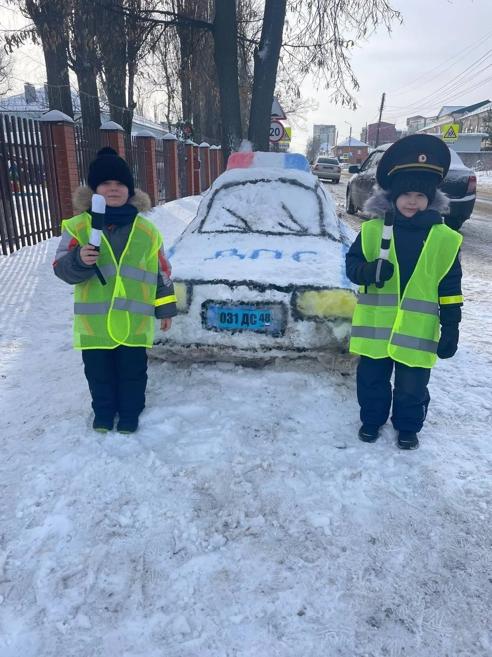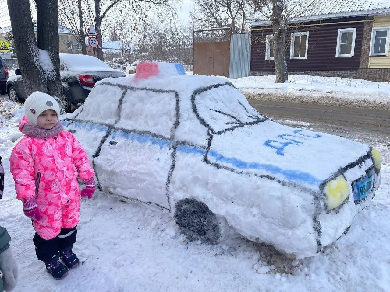 У детского сада №31 «Сказка» в Ельце появилась необычная инсталляция — слепленная из снега копия машины ДПС. Её создали дети вместе с воспитателями и участниками «Родительского патруля», чтобы напомнить водителям о внимательности рядом с детским садом.