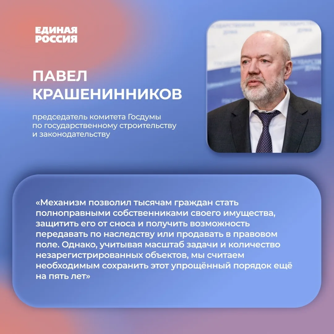 Продление механизма позволит гражданам и дальше в упрощённом порядке оформить права на гаражи и землю, снизить бюрократическую нагрузку и защитить имущество от рисков сноса. Оформленную недвижимость можно будет официально продать, подарить или передать по наследству.