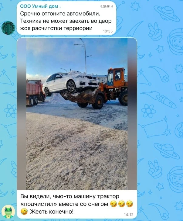 В домовых чатах горожане начали даже генерировать в нейросетях картинки, будто машину соседа «эвакуирует» трактор, чтобы обратить внимание на проблему.