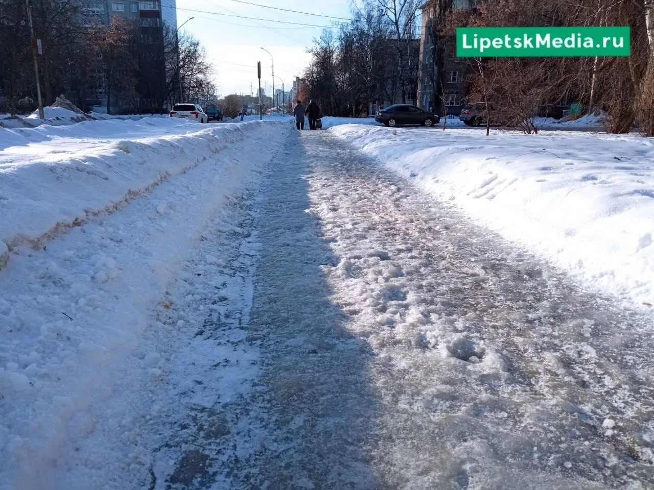 В Липецке на улице Липовской образовалась наледь на тротуаре. Горожане сравнивают участок с «ледяным аттракционом».