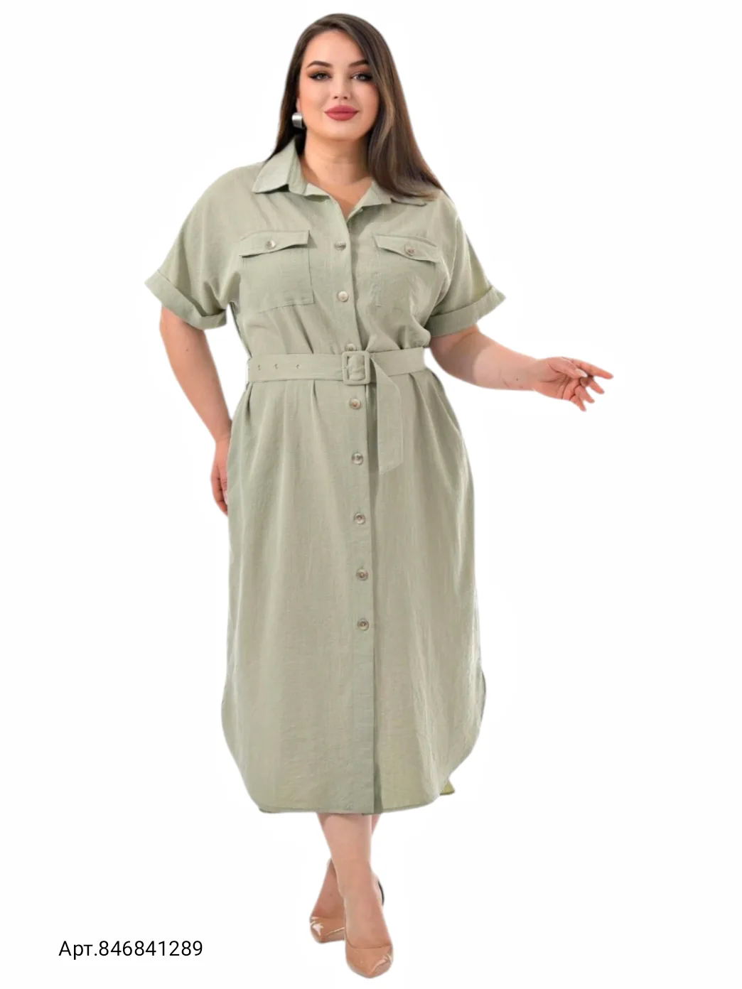 🌿Платье-рубашка оливкового цвета, пояс в комплекте, длинный рукав, свободный покрой, размеры от 36 до 70, цена 2876 руб