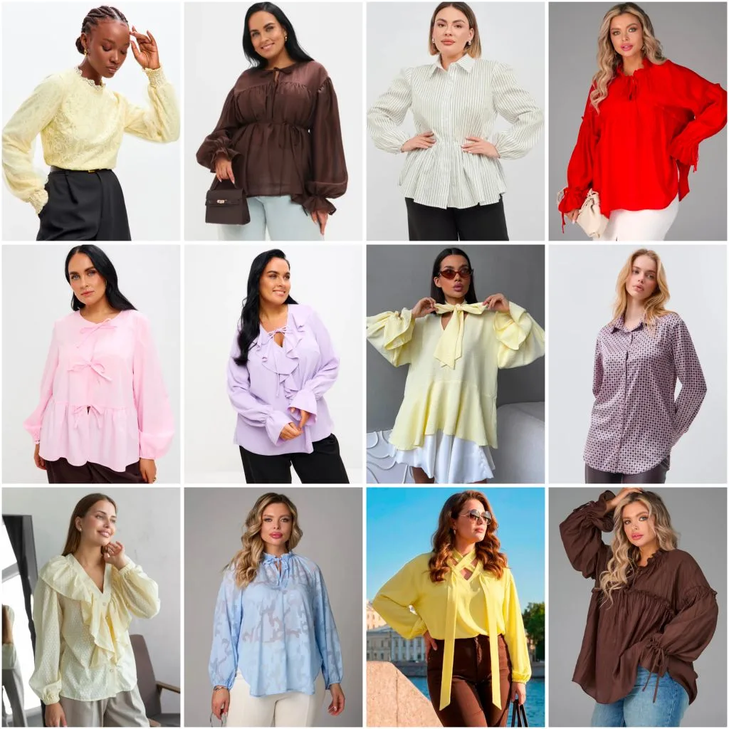 🔸Блузки красного цвета, 60% вискоза, 10% хлопок и 30% полиэстер, завязки, рюши, размеры от 48 до 62, цена 4705 руб