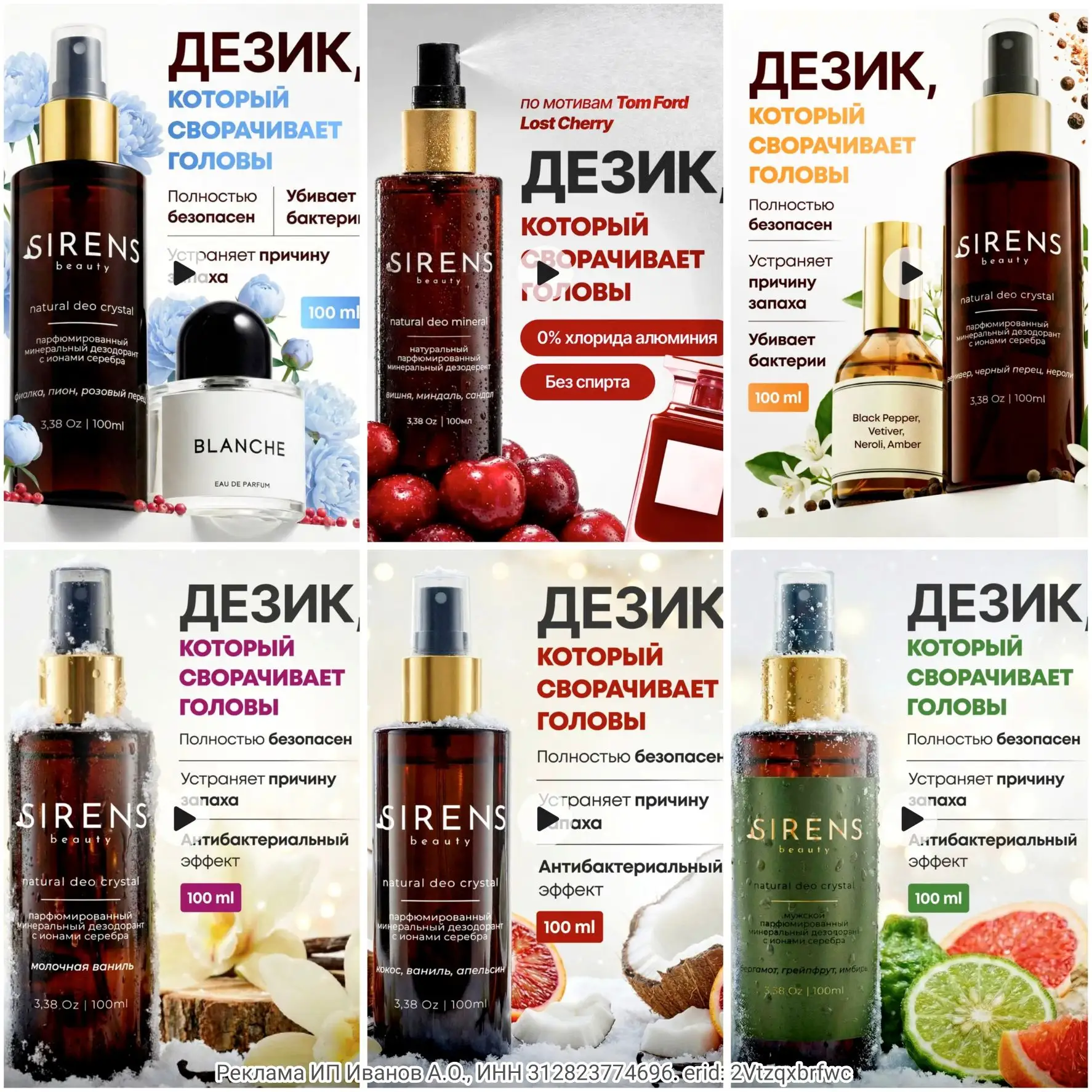 Весной хочется обновить не только гардероб, но и приобрести новые средства по уходу за собой! Я на весну и на лето всегда запасаюсь новыми дезодорантами, и один из моих фаворитов – натуральный женский минеральный дезодорант-спрей с лёгким освежающим, ненавязчивым ароматом «SIRENS». В отличие от обычных дезиков, он не только дезодорирует, но и снижает потоотделение, при этом не происходит блокировки сальных желез, а это значит, что ваша кожа будет дышать! Натуральный состав не раздражает кожу, а дополнительный компонент лактат натрия эффективно увлажняет и успокаивает кожу после бритья! Дезодорант «SIRENS» создан без агрессивных компонентов, в основе натурального состава – природный минерал алюмокалиевые квасцы. Дезодорант-спрей представлен в удобном мини-формате 100 мл – его можно легко брать с собой в дорогу, в спортзал, в путешествие. Ароматы на выбор – приятные, ненавязчивые, лёгкие, не перебивающие ваш основной парфюм! Ароматы у минерального дезодоранта «SIRENS» есть разные, оставлю вам ссылки и артикулы на некоторые, так что выбирайте на свой вкус: