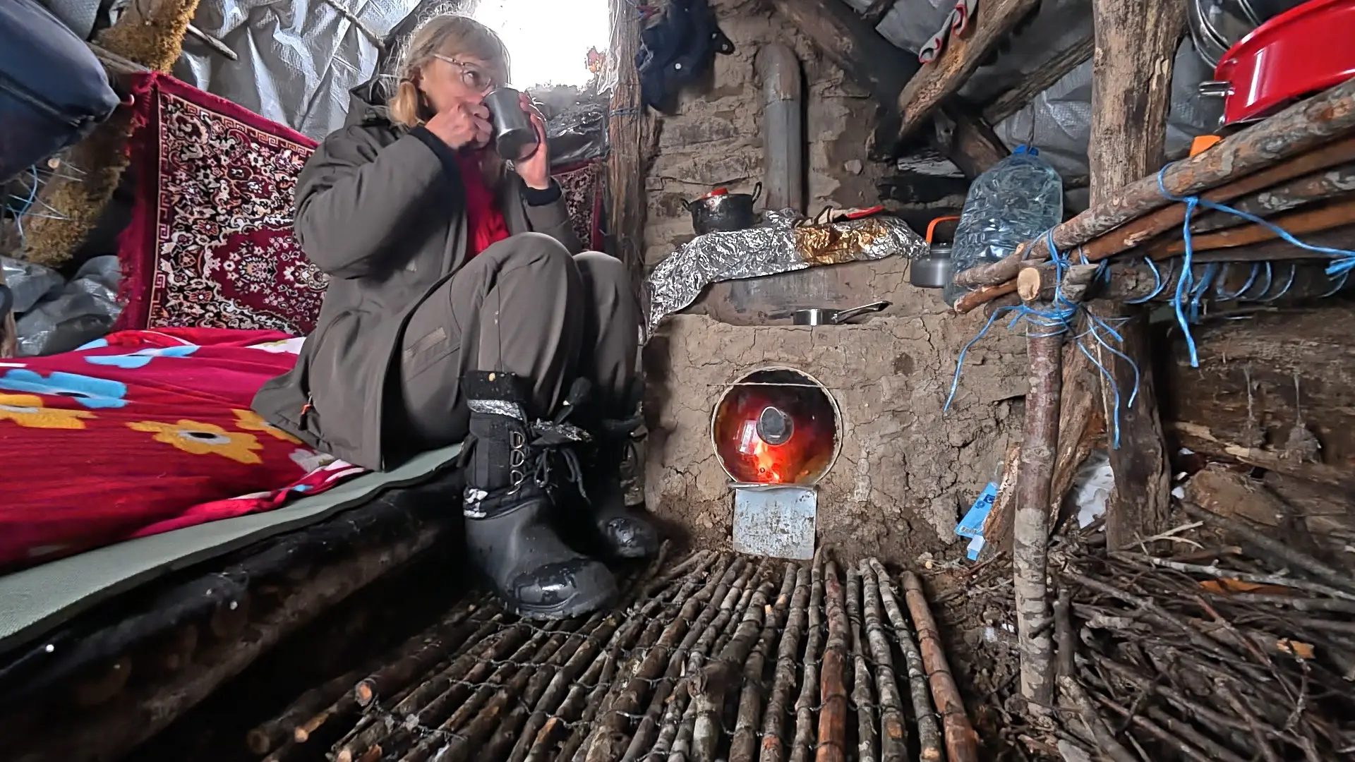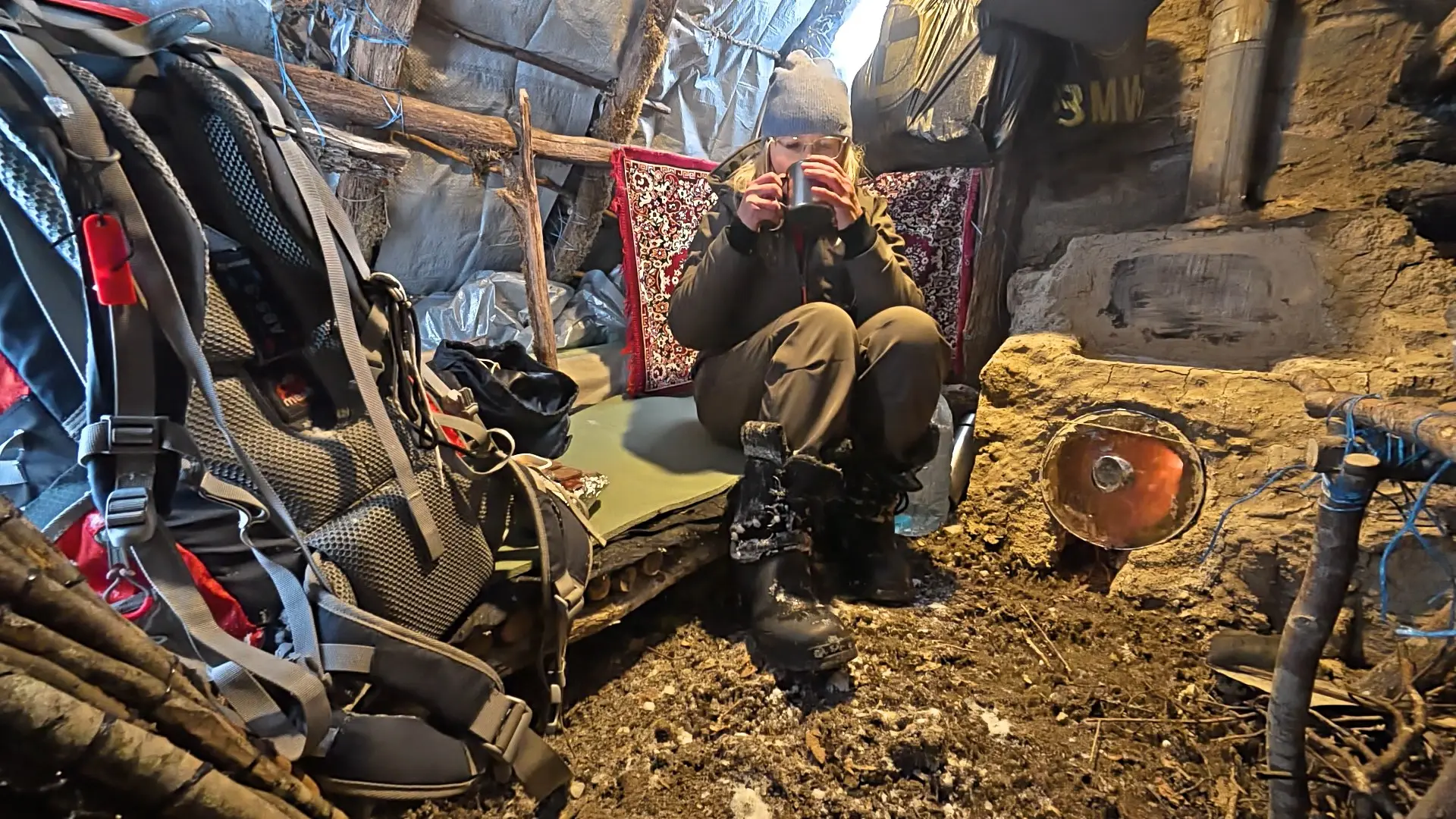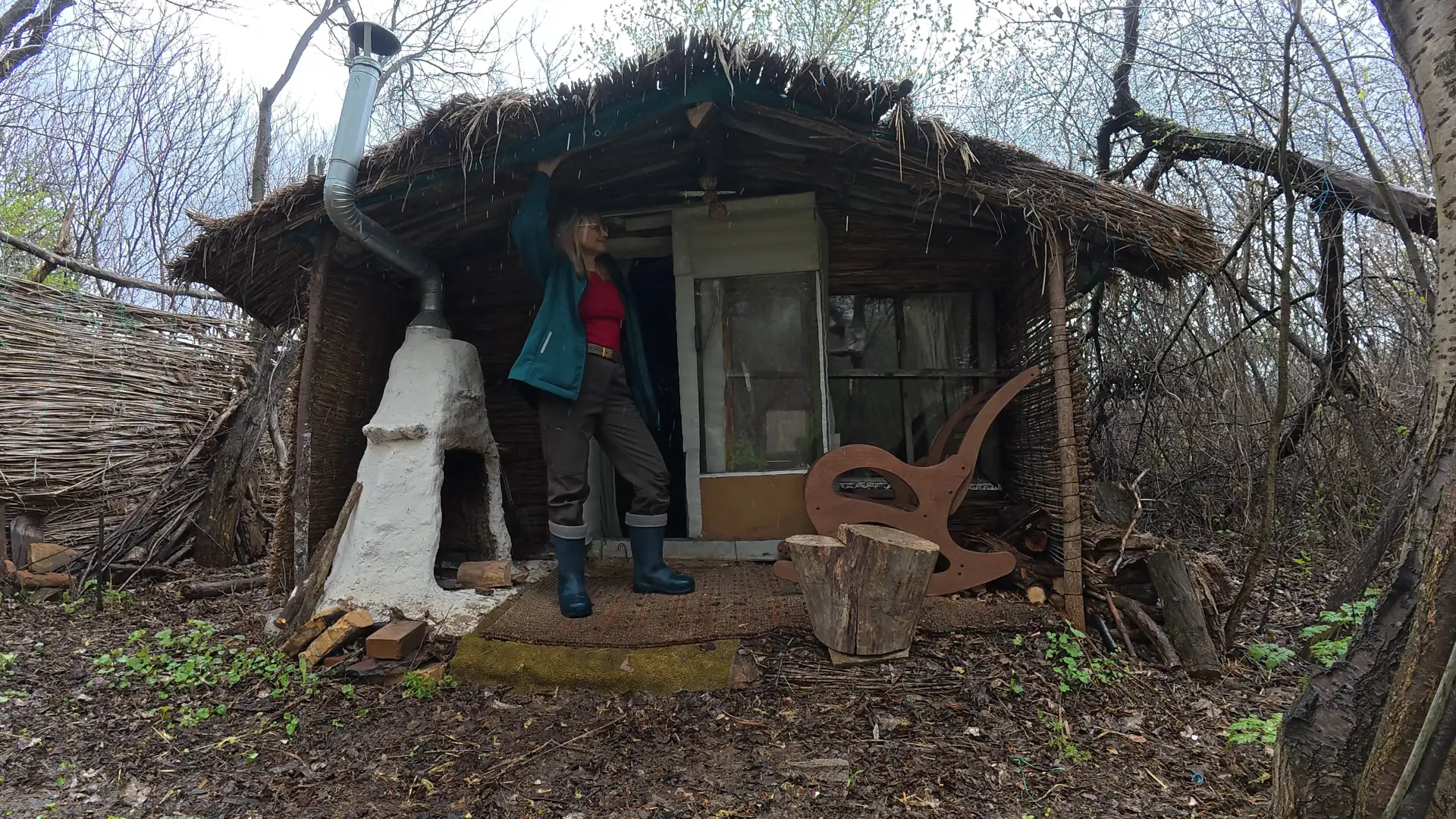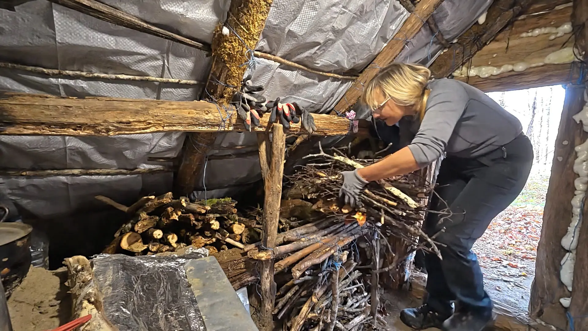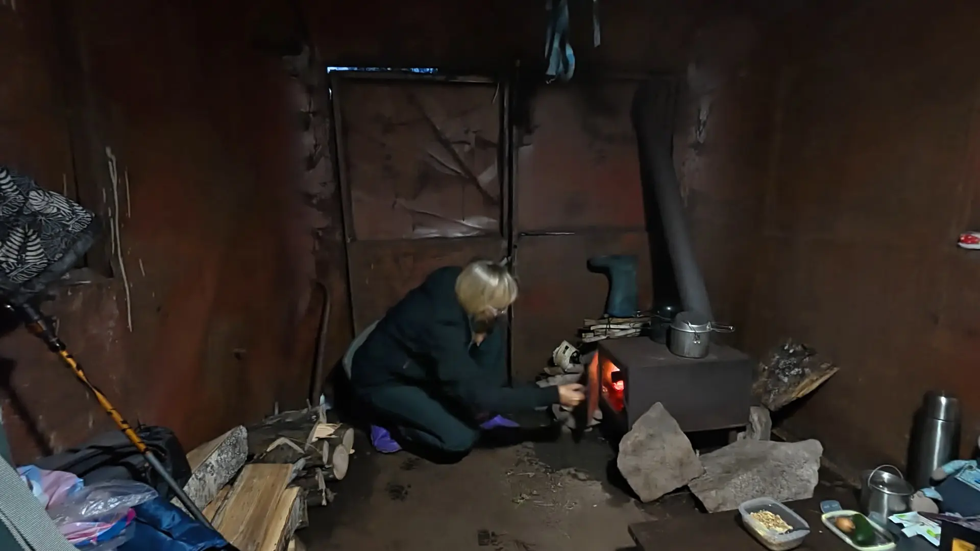 Да, внутри еще не обустроено, но, между тем, уже тепло. Уже есть печь. Можно приготовить пищу, высушить вещи и обогреться самой.