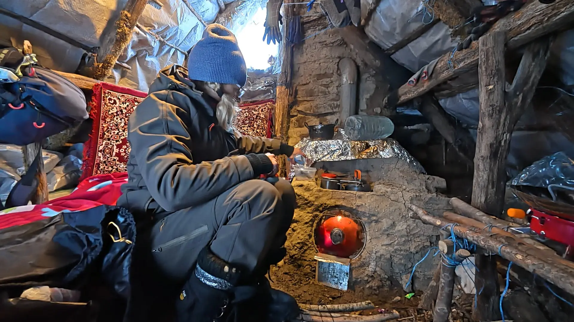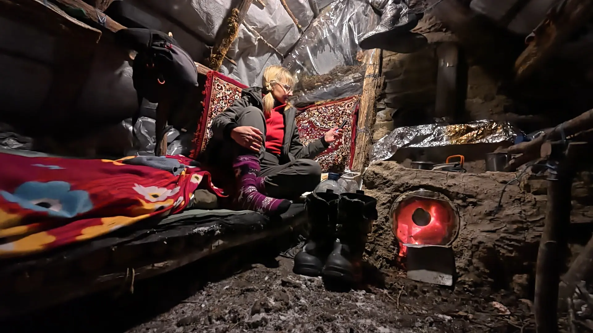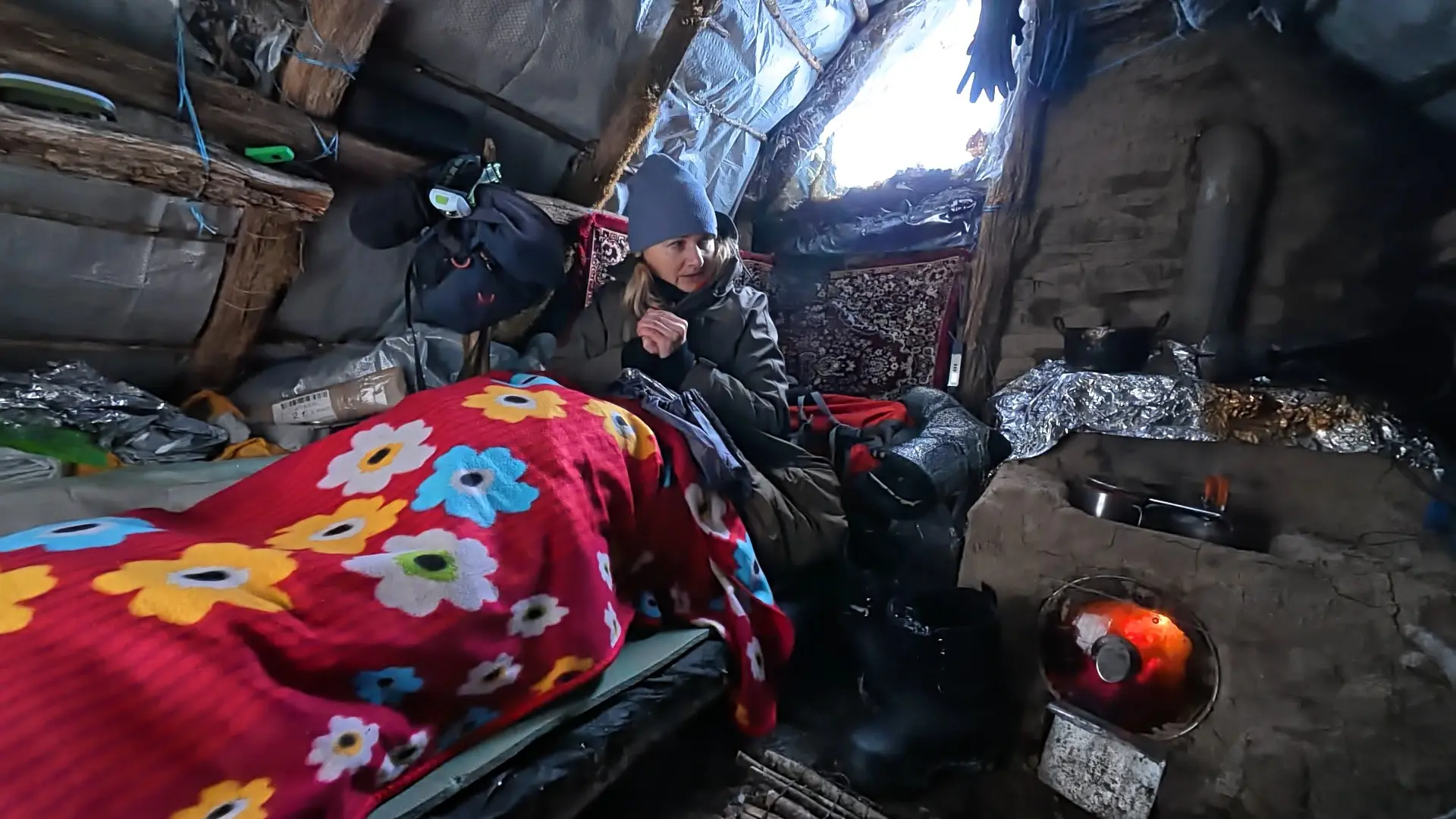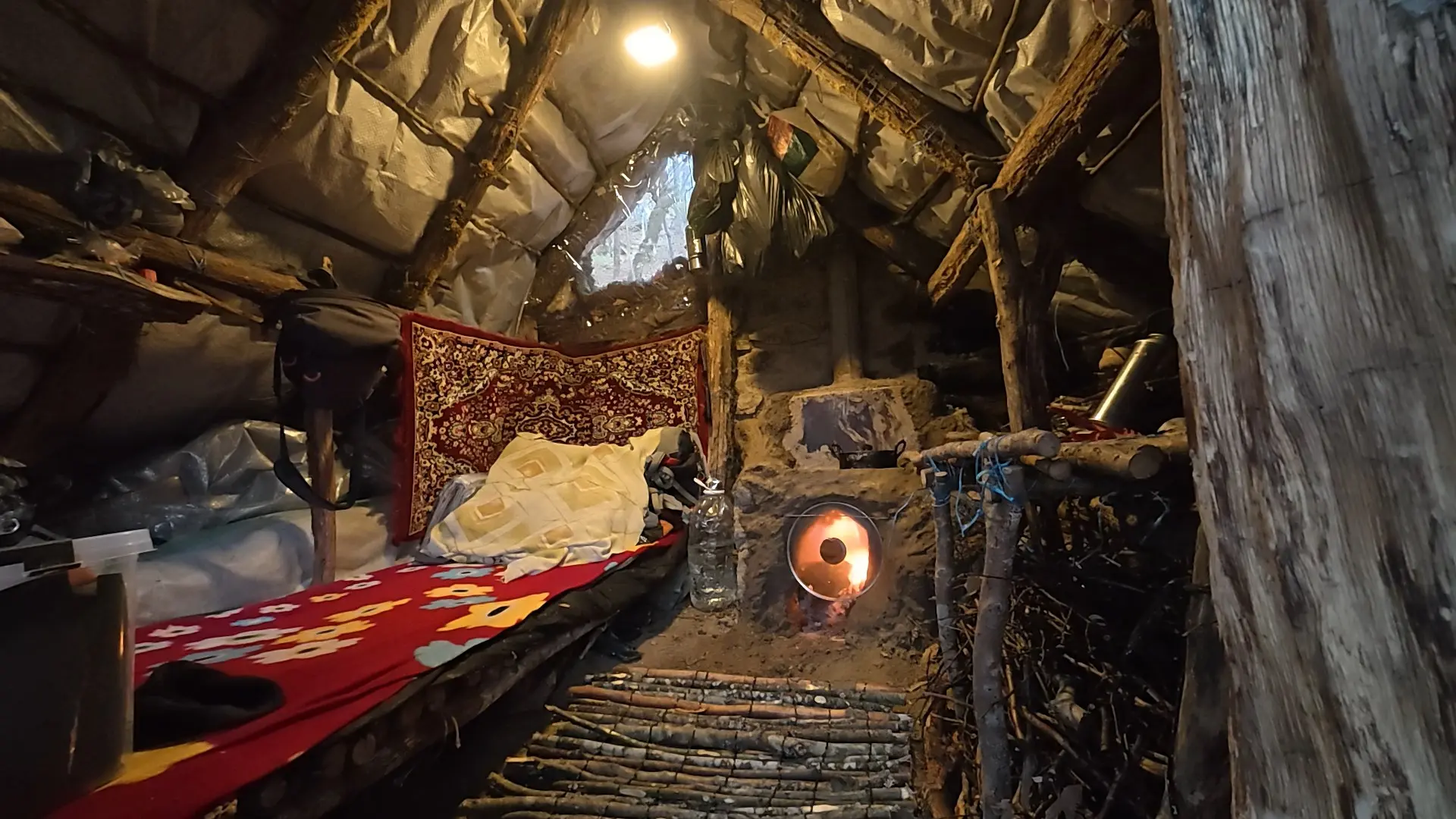 Да, внутри еще не обустроено, но, между тем, уже тепло. Уже есть печь. Можно приготовить пищу, высушить вещи и обогреться самой.