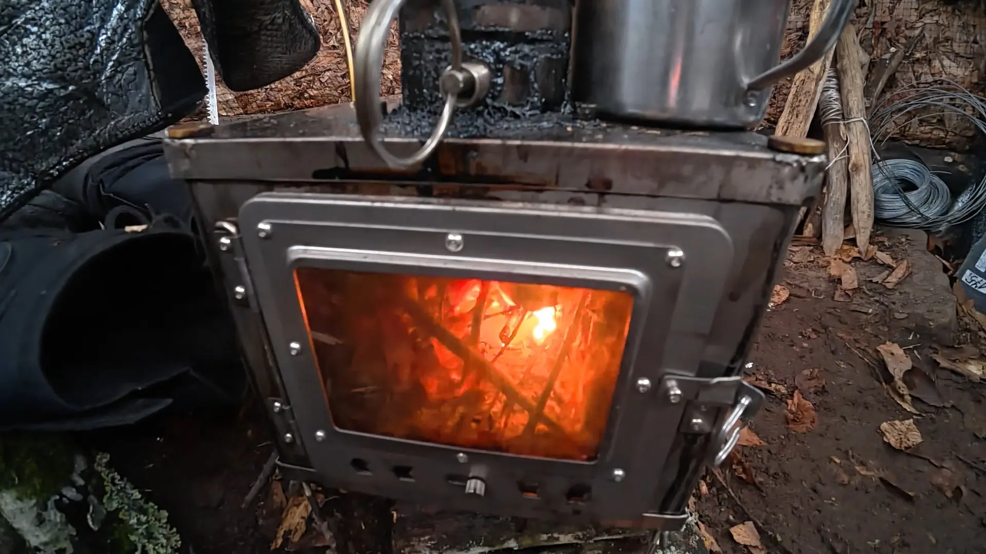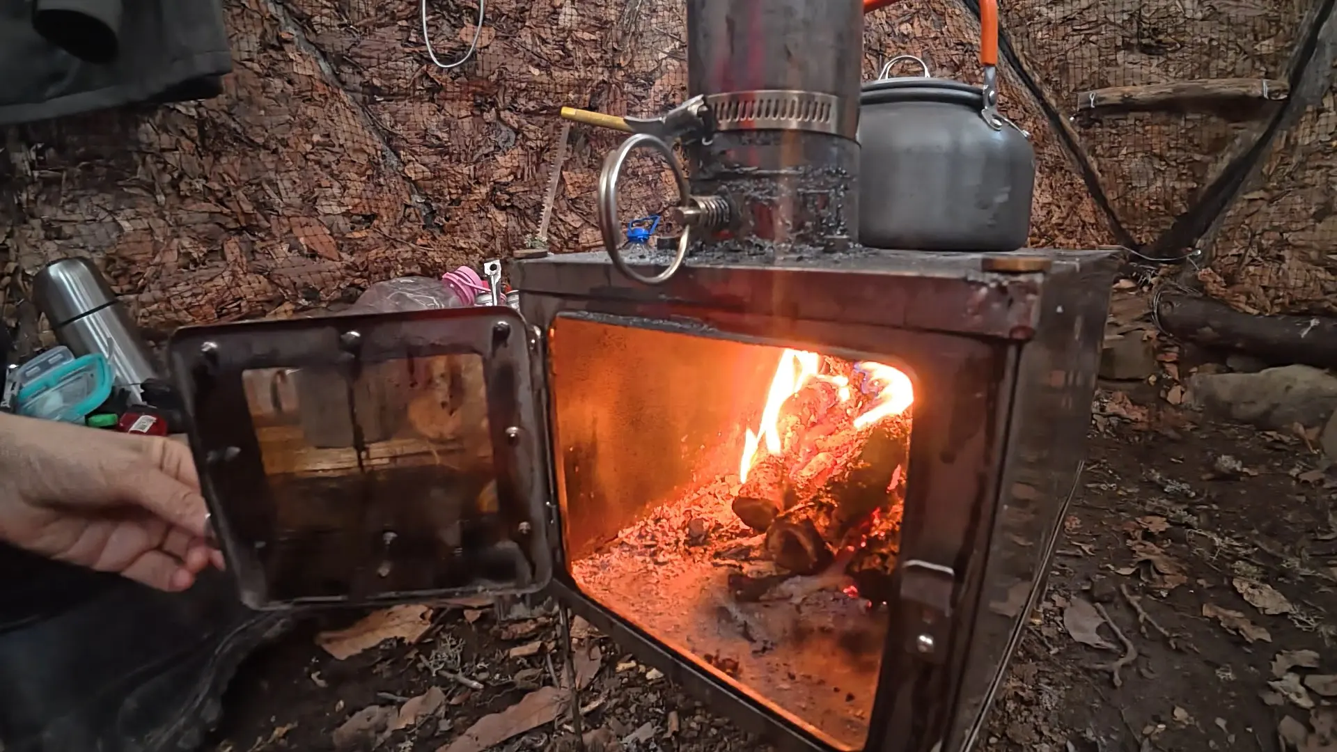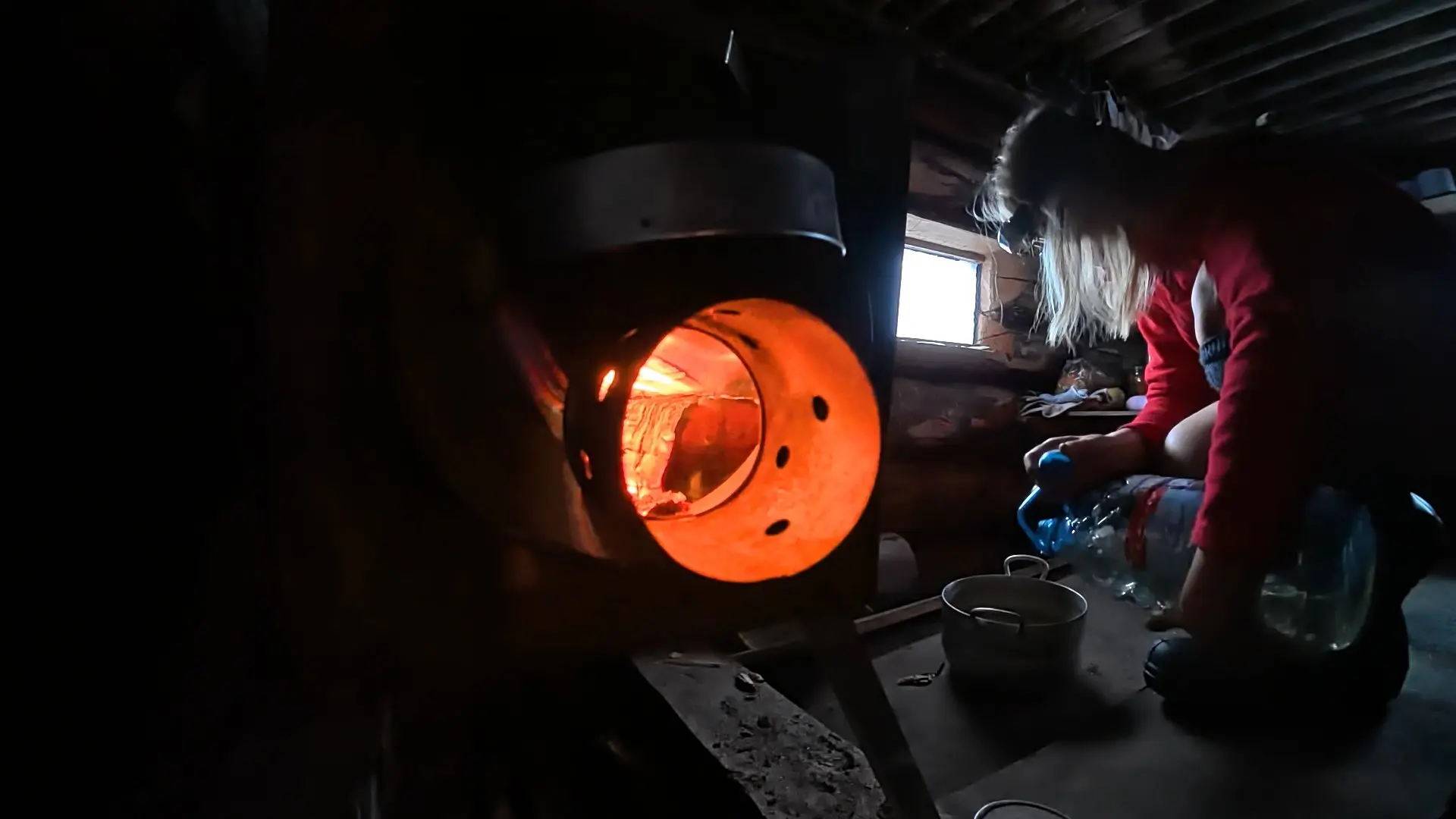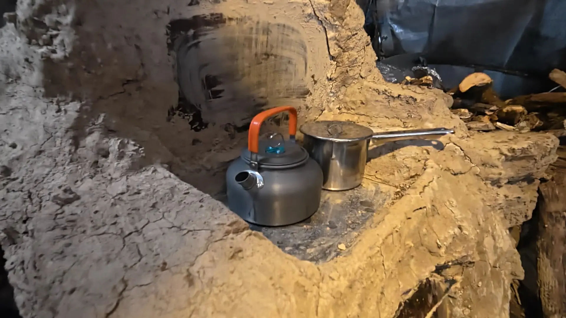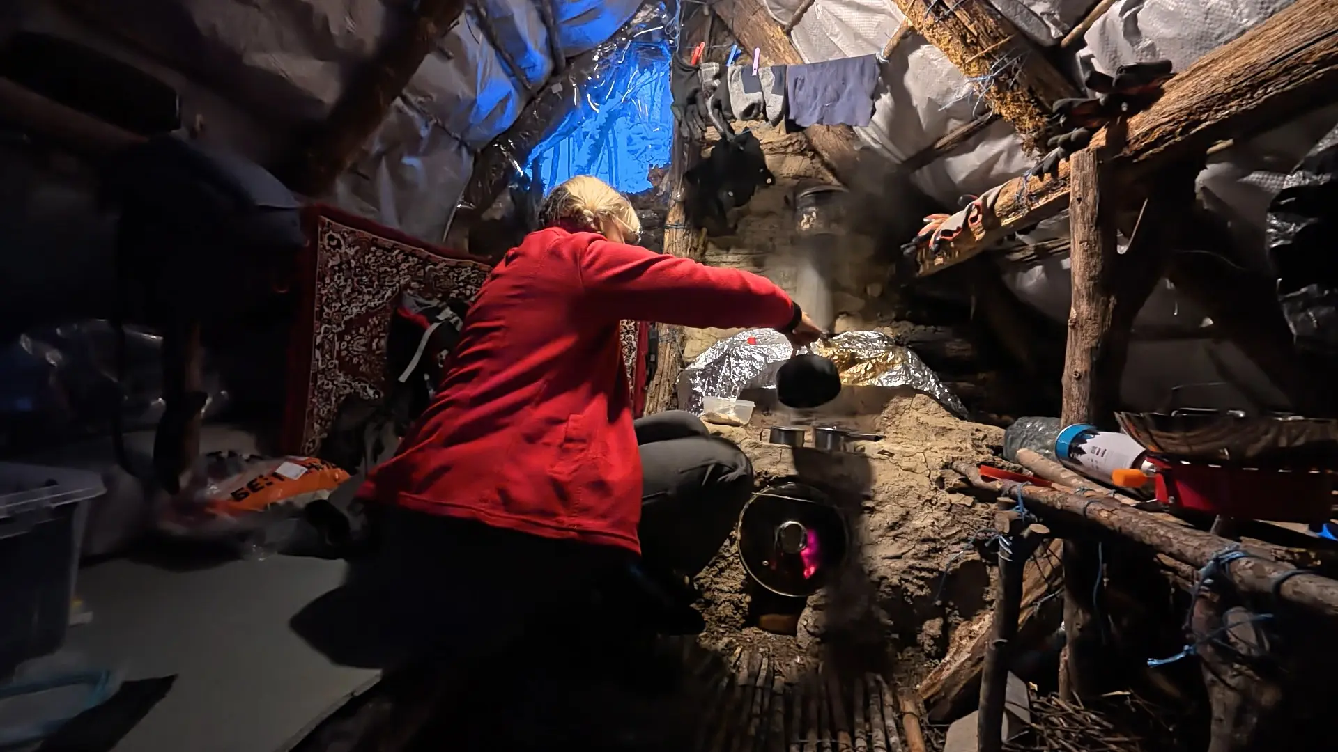 Да, внутри еще не обустроено, но, между тем, уже тепло. Уже есть печь. Можно приготовить пищу, высушить вещи и обогреться самой.