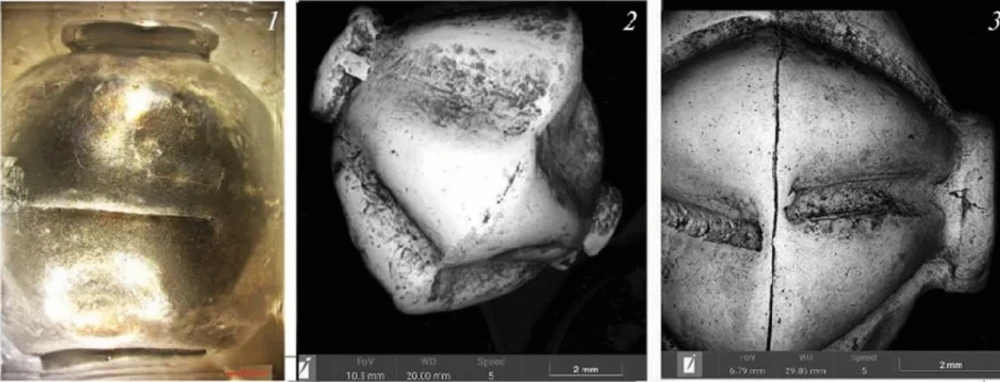 *Фото бусины под стереомикроскопом (1) и ребристых бусин, снятых сканирующим электронным микроскопом с обратным рассеянным излучением (2, 3).