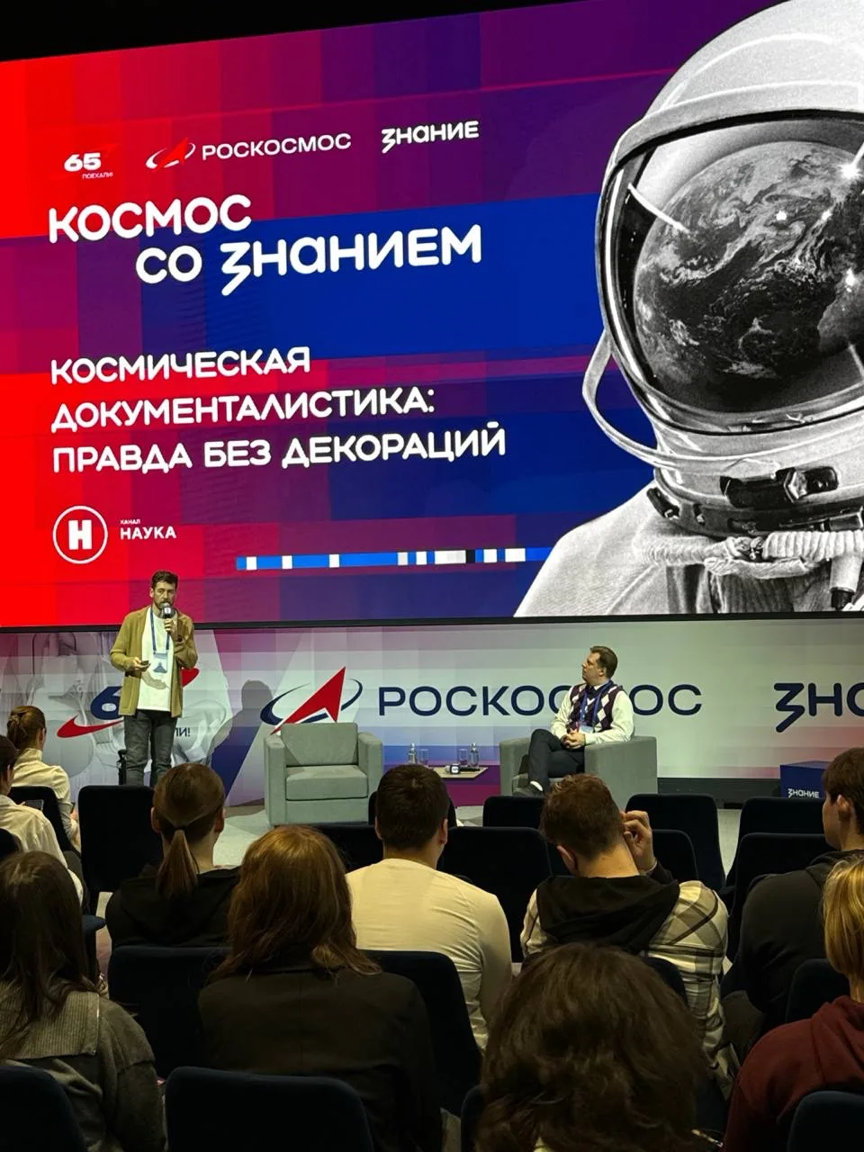 Телеканал «Наука» тоже принял участие. Главный редактор Алексей Резепкин и режиссер Игорь Маликов провели лекцию «Космическая документалистика: правда без декораций». Они рассказали, как создаются документальные фильмы о космосе, в чем особенности съемок и как научные знания превращаются в интересные истории для миллионов зрителей.