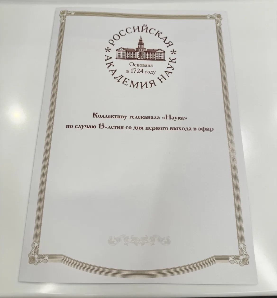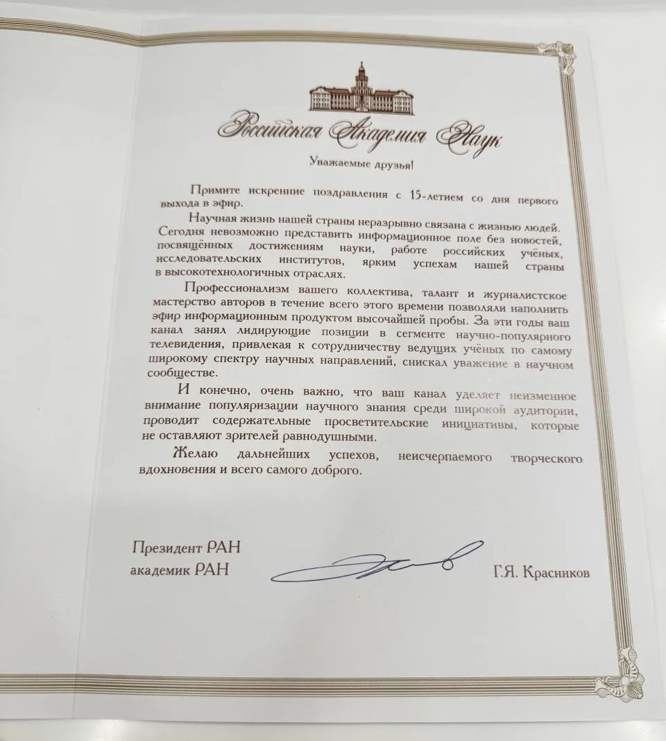 Российский научный фонд в лице заместителя генерального директора РНФ Андрея Блинова поздравил наш телеканал с 15-летием.
