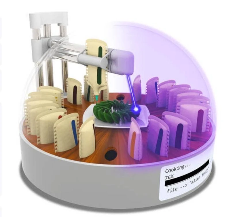 *на 3 фото концептуальное изображение устройства по производству продуктов питания, который может одновременно печатать и готовить еду.