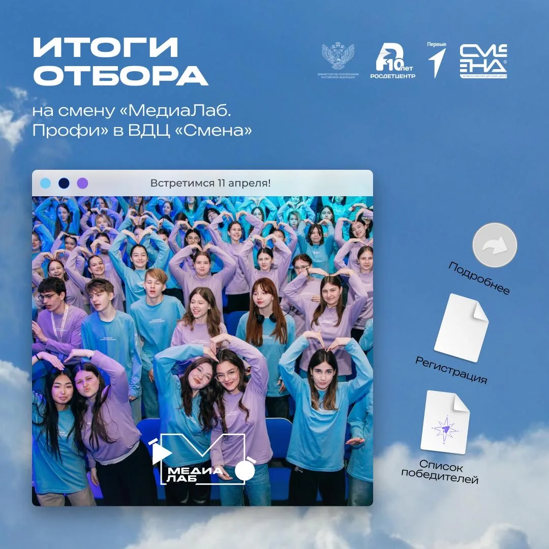 Пора начать подготовку к конкурсному отбору на смену «МедиаЛаб.Профи». Она пройдет с 11 по 24 апреля во Всероссийском детском центре «Смена» для студентов профессиональных образовательных организаций в возрасте от 14 до 17 лет.