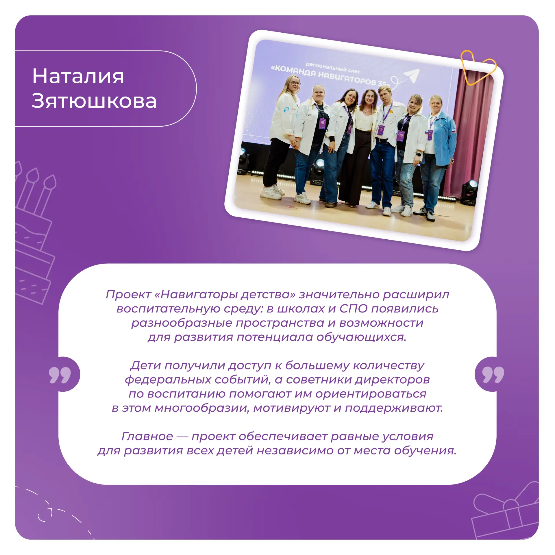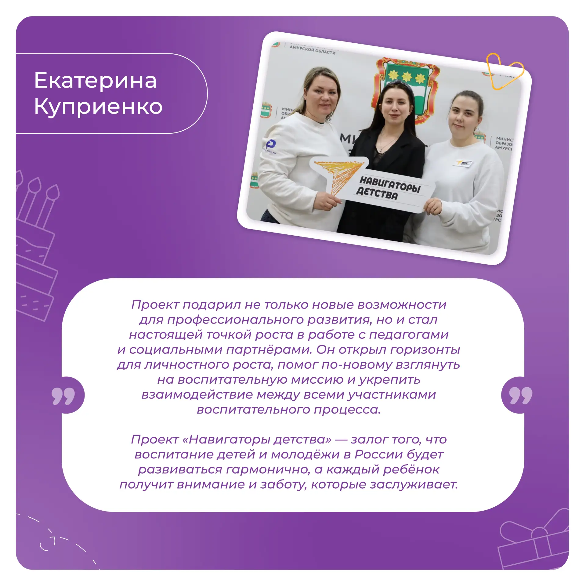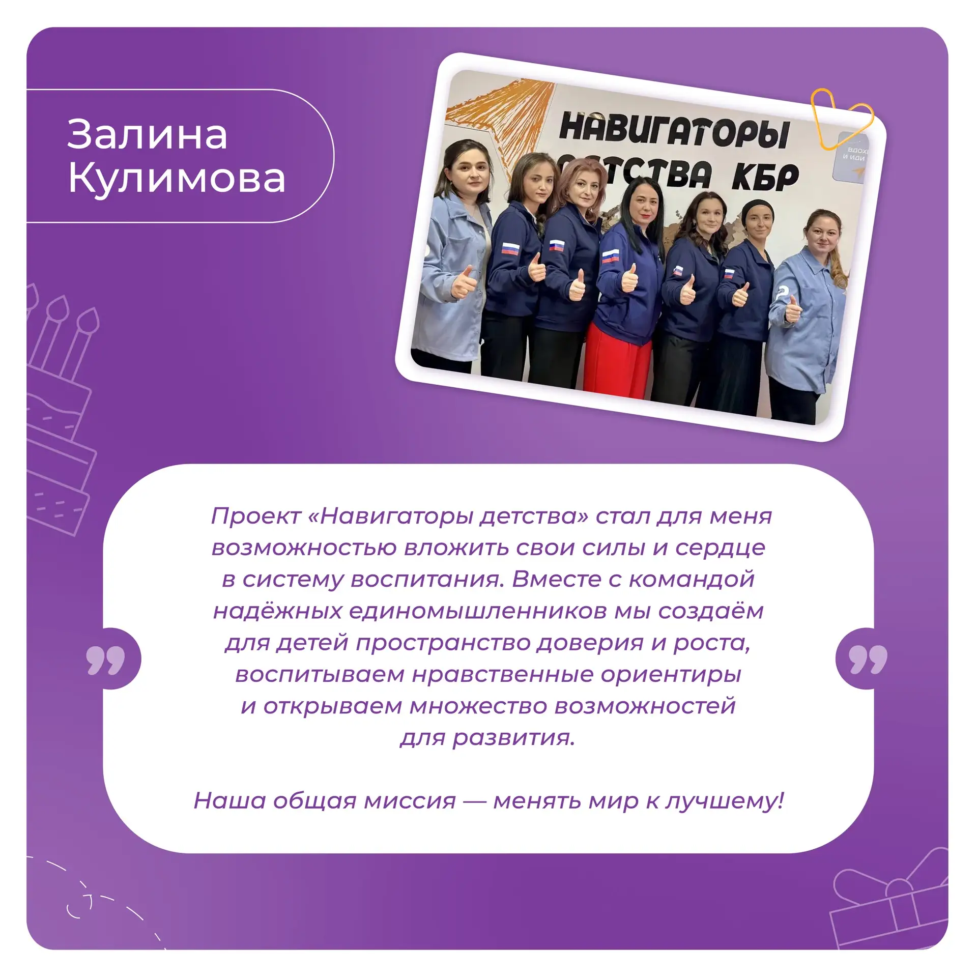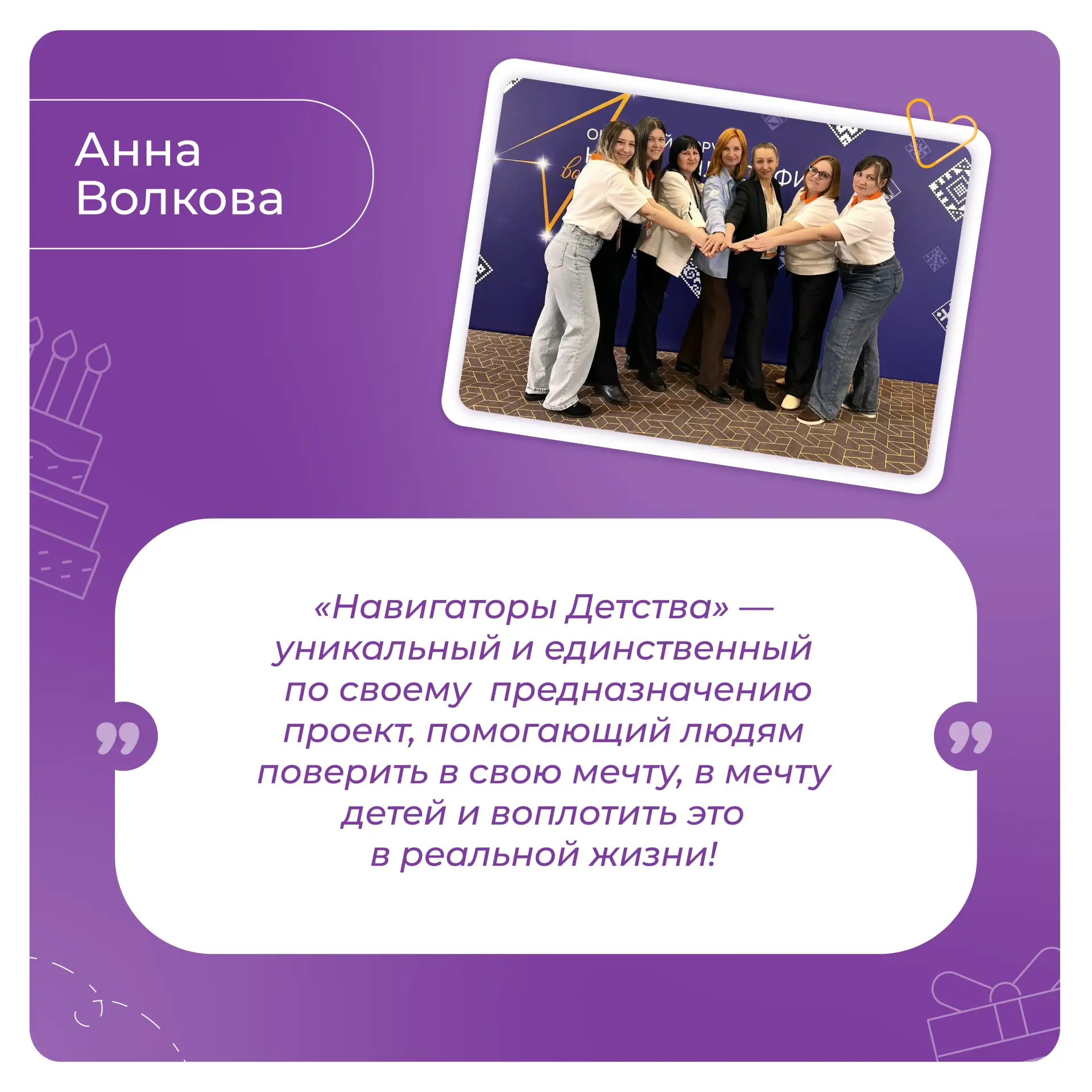 Мы благодарим Вас за энергию, неравнодушие и ежедневный вклад в развитие проекта «Навигаторы детства». Пусть работа приносит радость и новые возможности, поддержка близких, друзей и единомышленников сопровождает на пути к вершинам профессиональных достижений, а каждый день открывает поводы для побед!