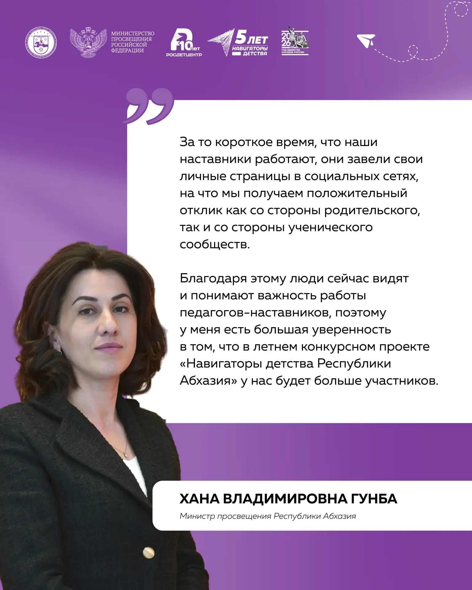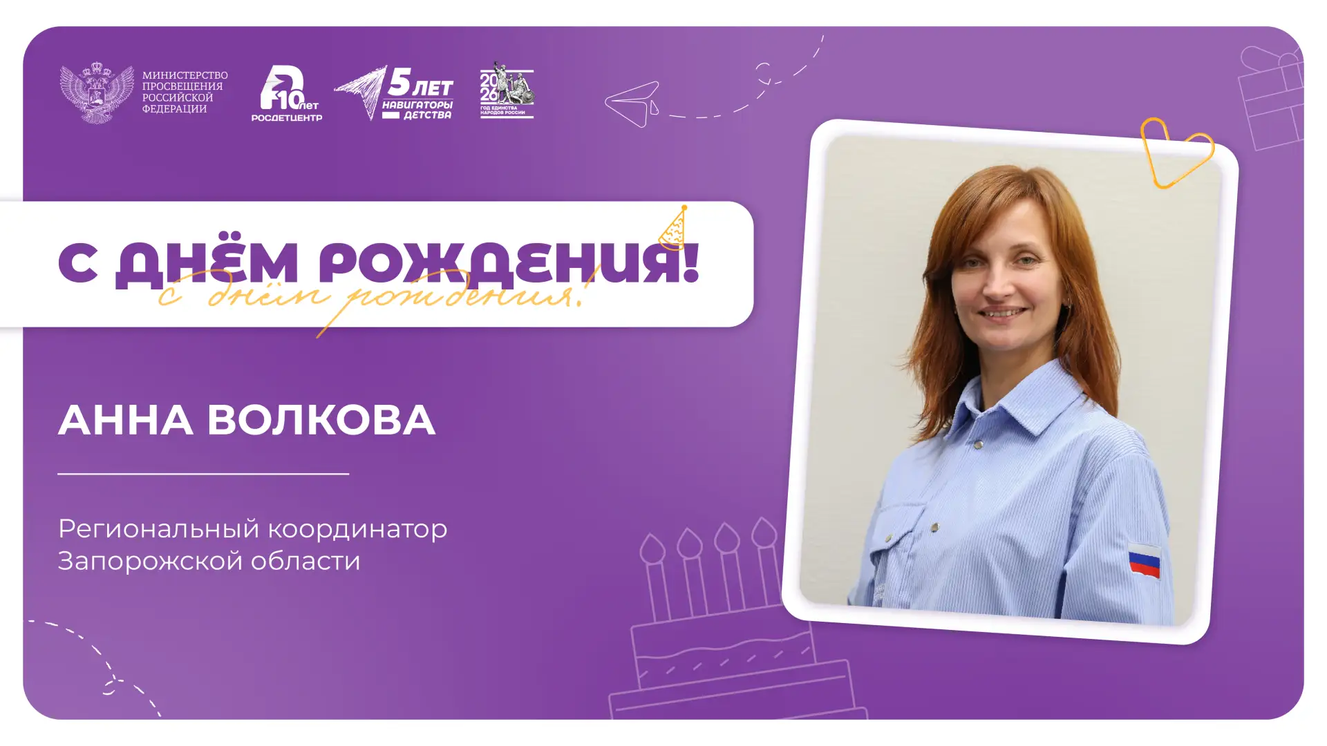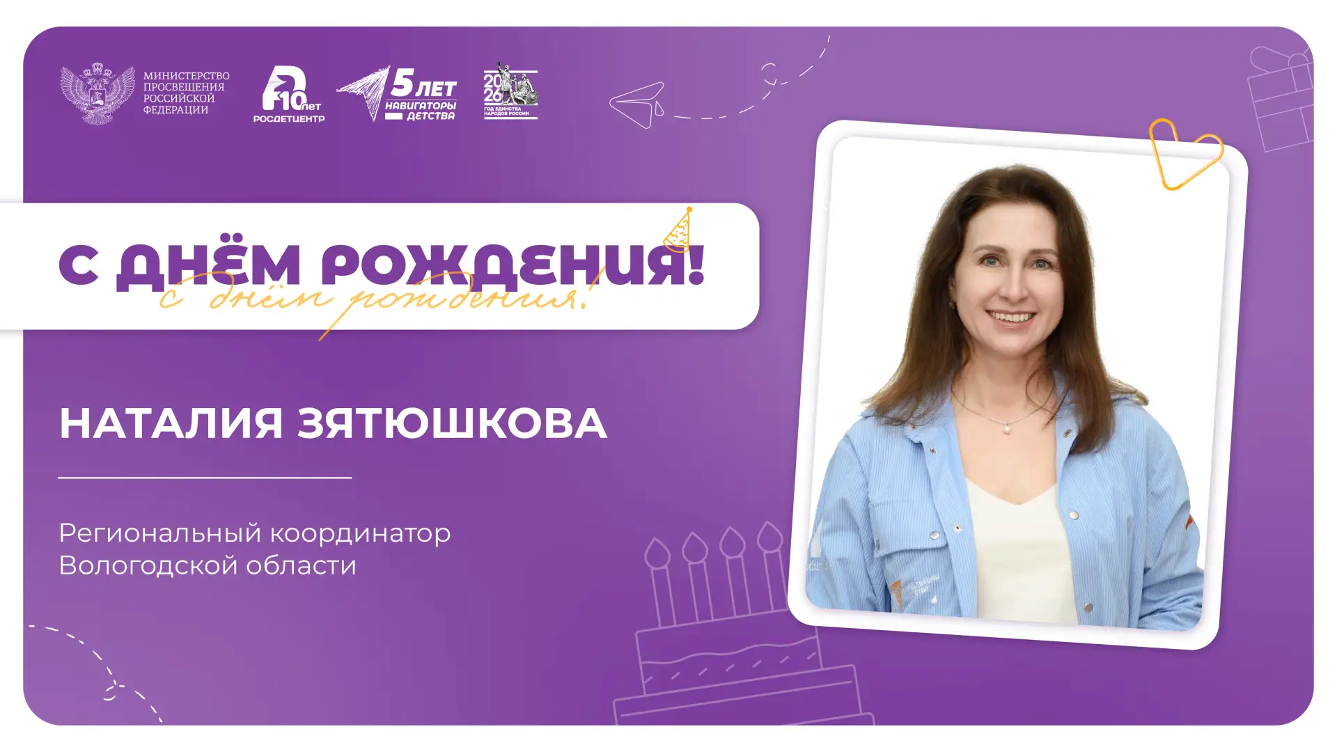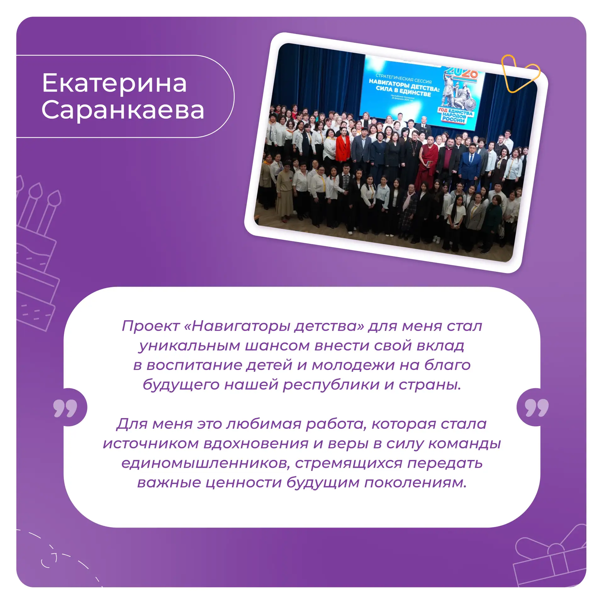 Мы благодарим Вас за энергию, неравнодушие и ежедневный вклад в развитие проекта «Навигаторы детства». Пусть работа приносит радость и новые возможности, поддержка близких, друзей и единомышленников сопровождает на пути к вершинам профессиональных достижений, а каждый день открывает поводы для побед!