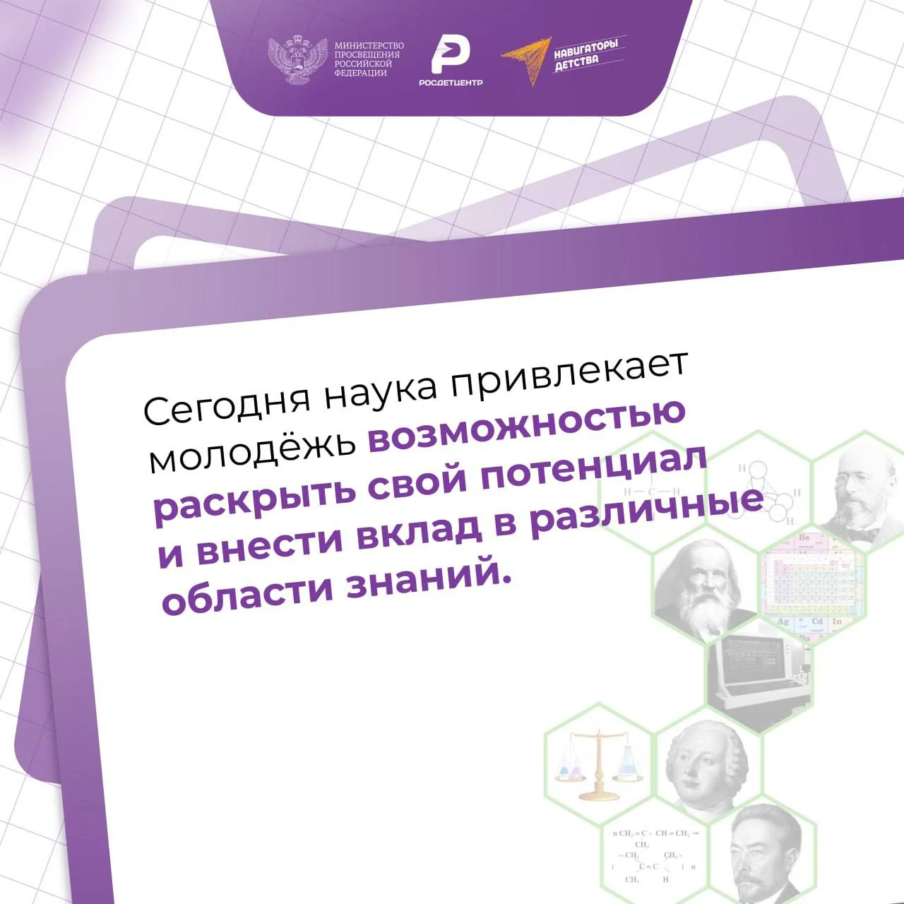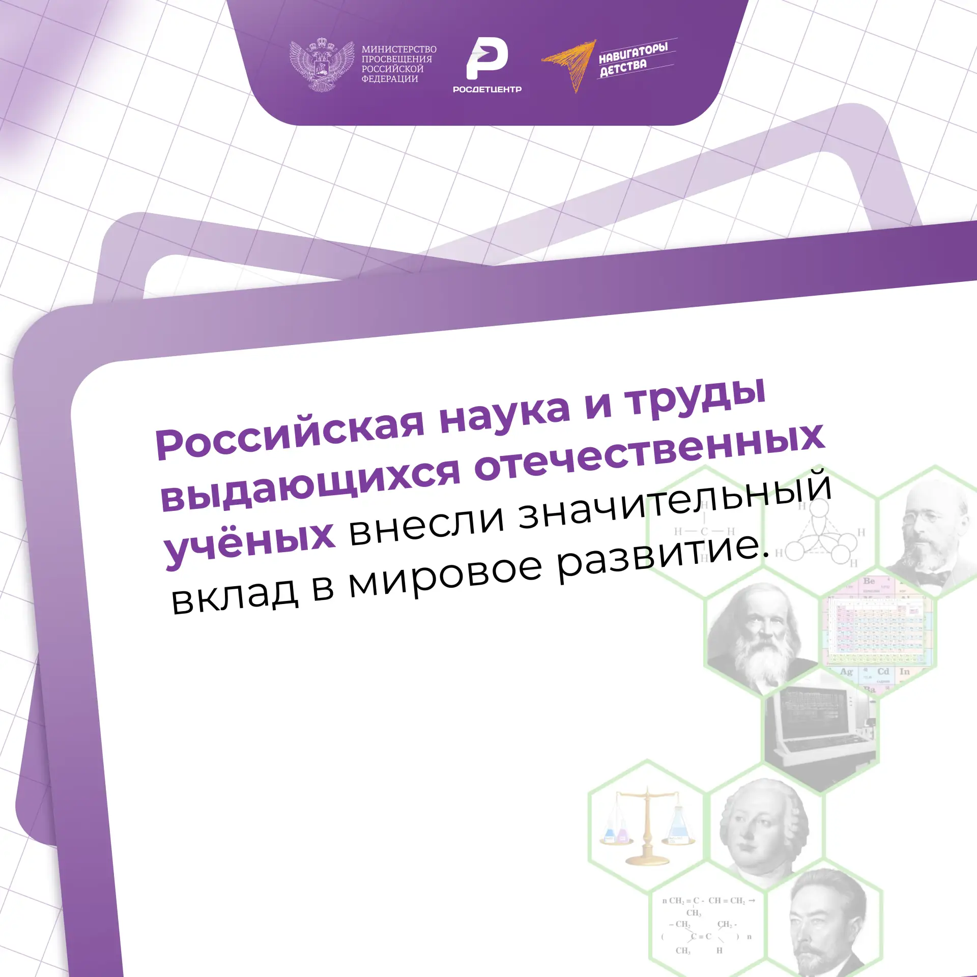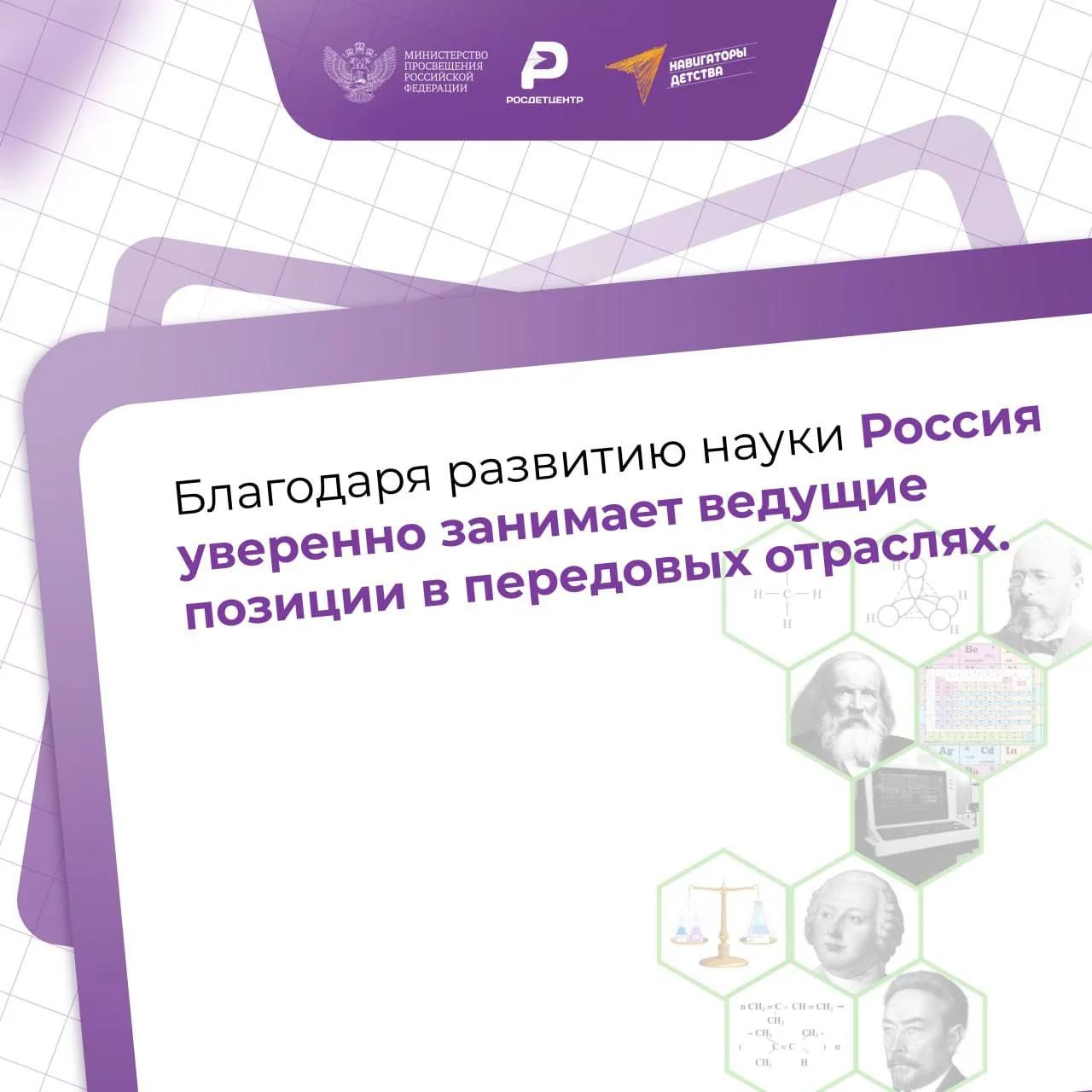 Имена выдающихся российских учёных - М.В. Ломоносова, Д.И. Менделеева, Л.Д. Ландау, Ж.И. Алфёрова и других - золотыми буквами вписаны в летопись мировых научных достижений. Представители современной школы достойно продолжают их дело, обеспечивая нашей стране научное лидерство в физике, химии, атомной энергетике, космосе и иных областях!🇷🇺