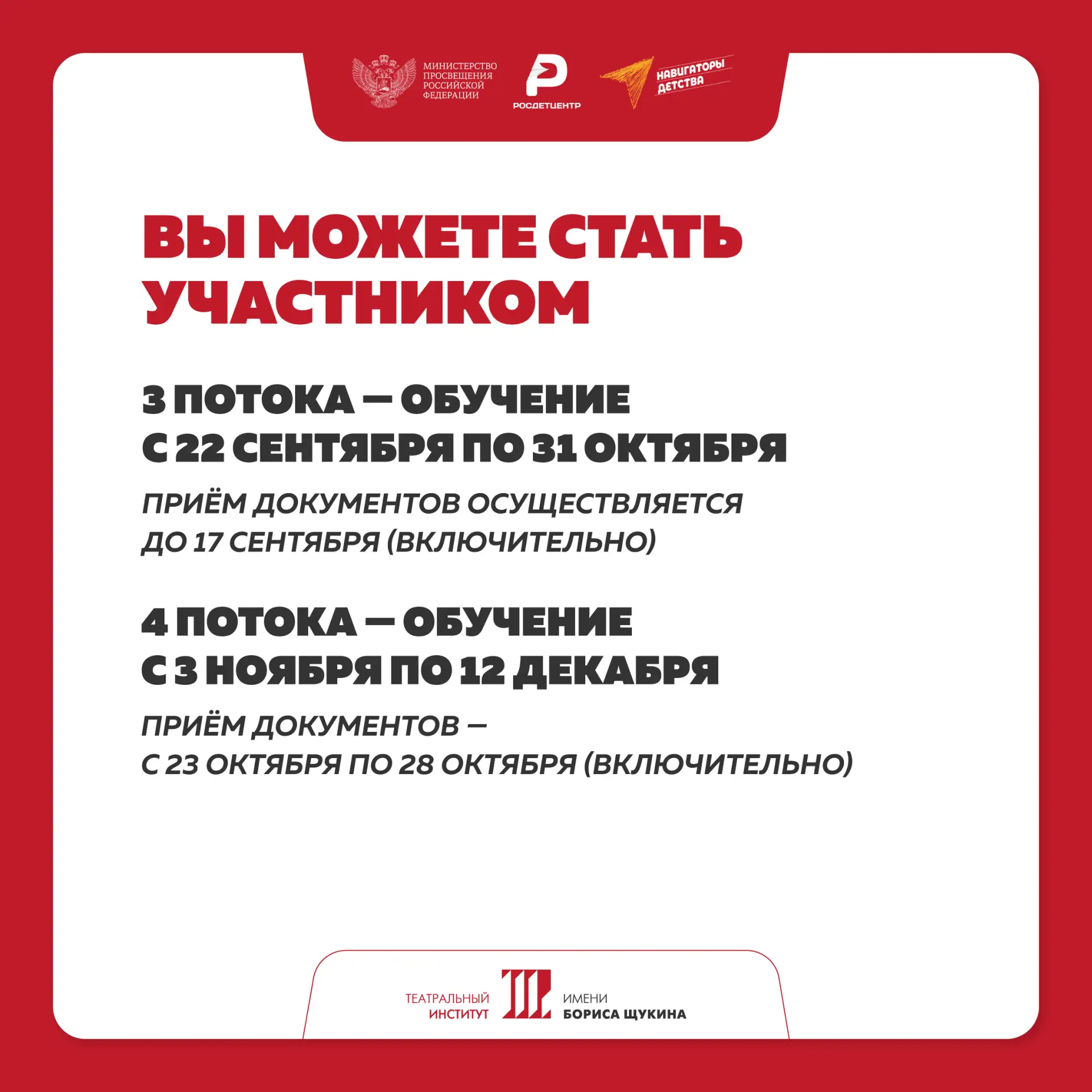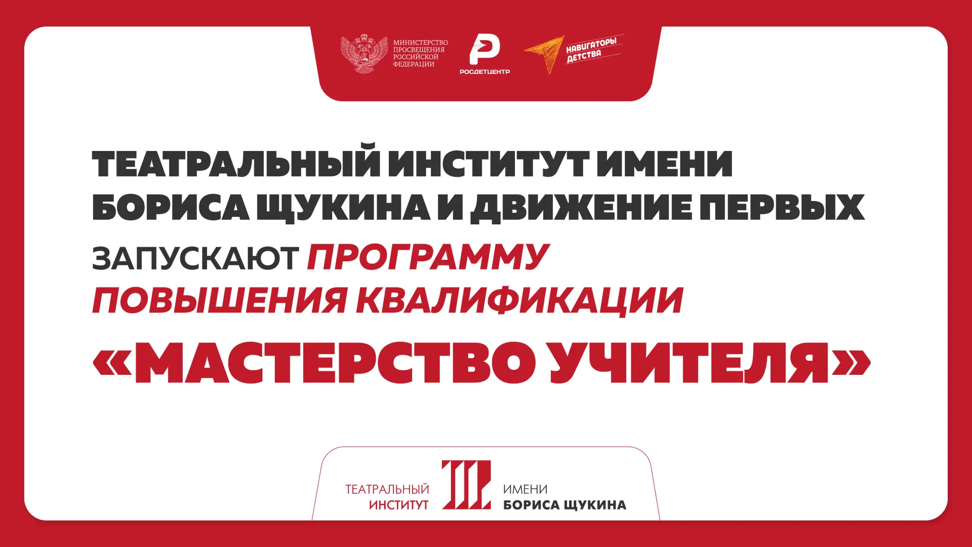 Театральный институт имени Бориса Щукина совместно с Движением Первых запустил программу дополнительного профессионального повышения квалификации для учителей и педагогов, которые активно развивают школьные театры в рамках дополнительного образования детей.