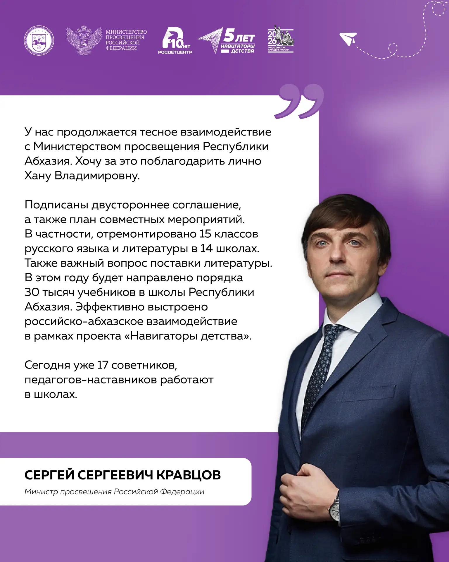 «Искренняя признательность учителям и наставникам. Благодаря вам миллионы мальчишек и девчонок не только получают качественные знания по естественным наукам — многие из них решают связать свою жизнь с космонавтикой. Дорогие друзья! Пусть учёба станет прочным фундаментом для новых открытий и достижений, а славные традиции, заложенные легендарным Юрием Гагариным, живут в ваших делах и приумножаются вашими успехами. Верьте в свои силы и смело идите к цели!», — сказал Сергей Кравцов.