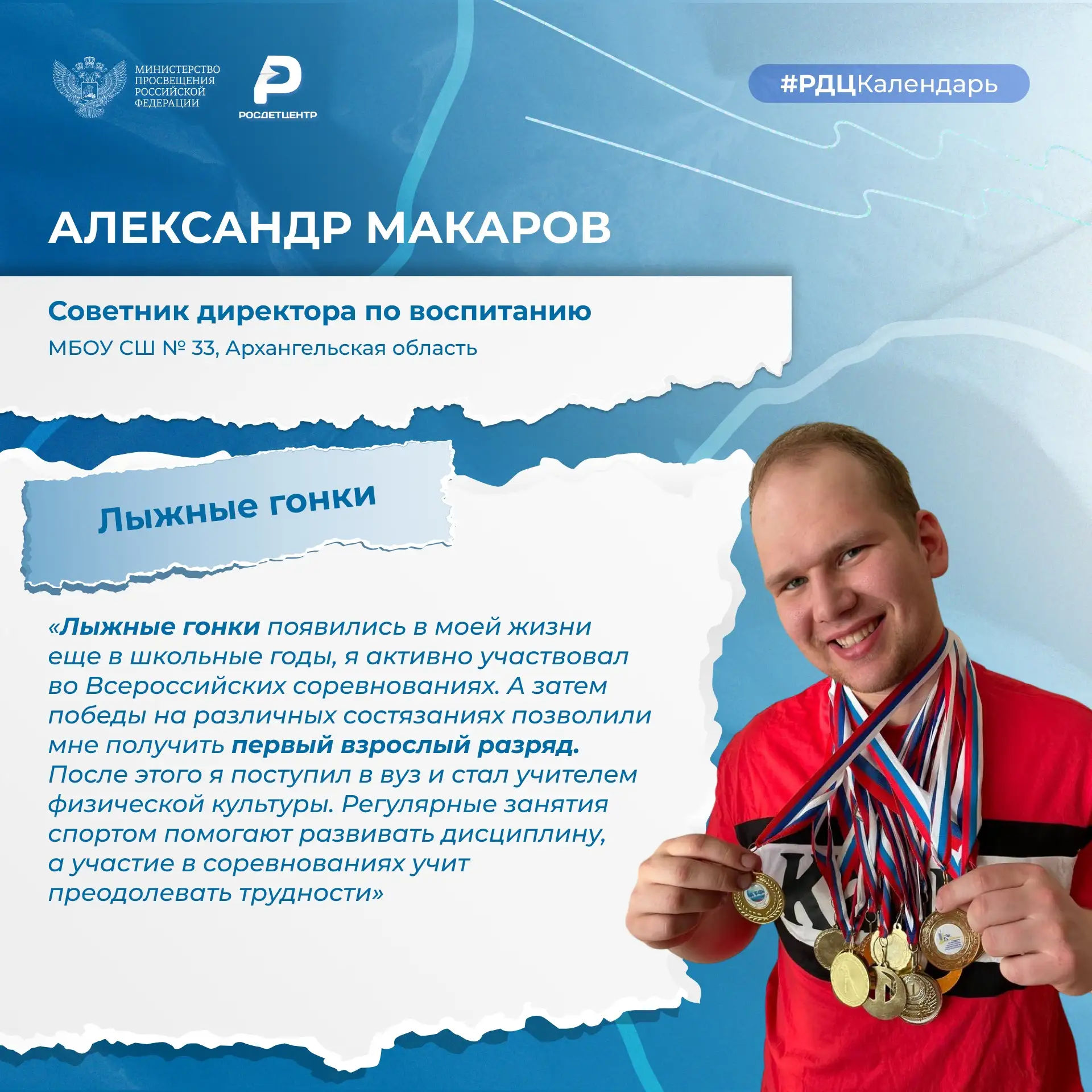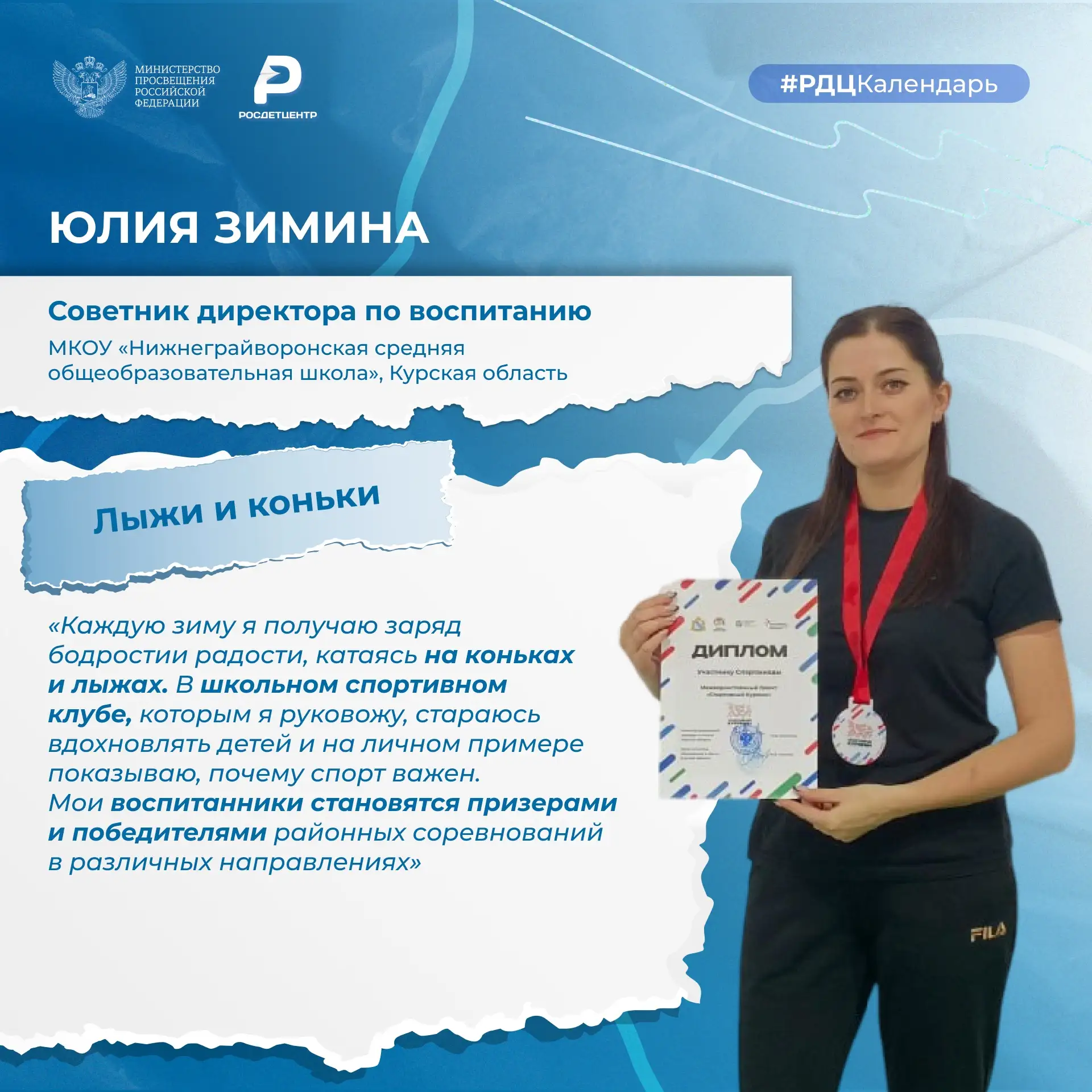 Среди команды наставников много активных и неравнодушных к спорту людей. Они катаются на сноуборде, лыжах и коньках, играют в хоккей с шайбой. В копилке их наград – множество медалей за победы в соревнованиях. Многие из советников директоров по воспитанию развивают школьные спортивные клубы: под их чутким руководством ученики занимают призовые места на состязаниях.