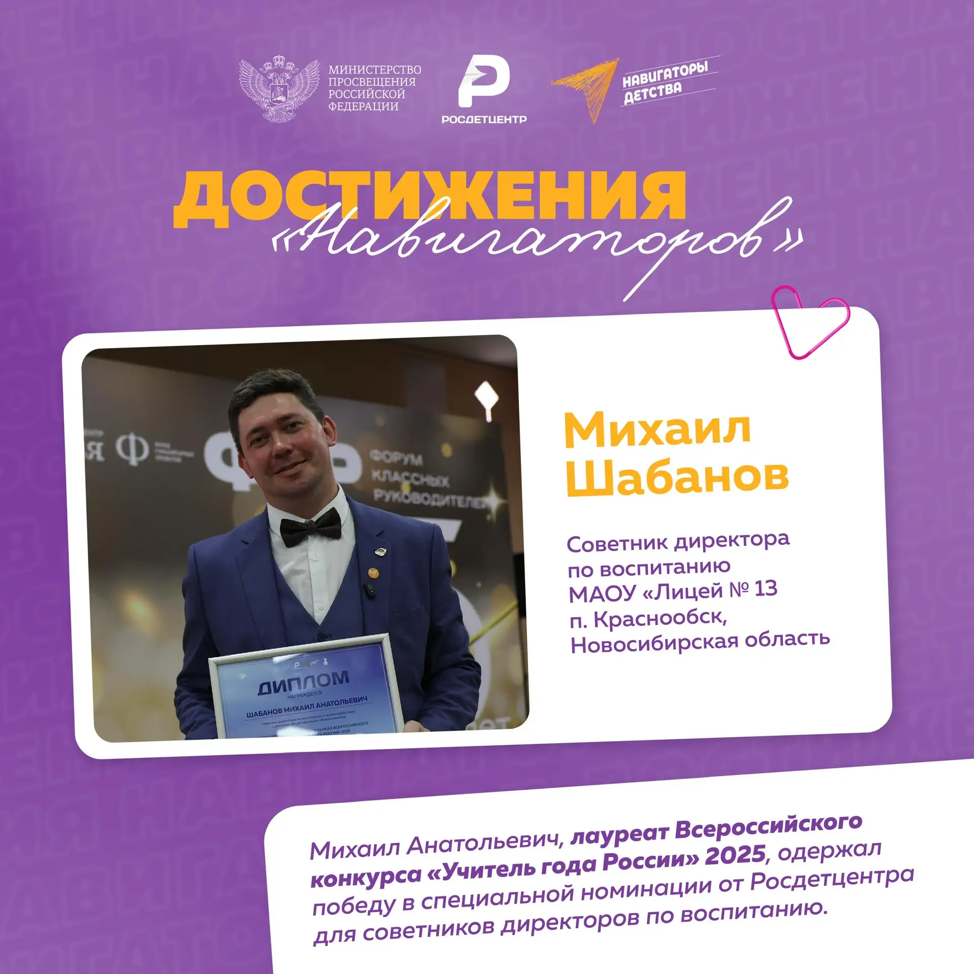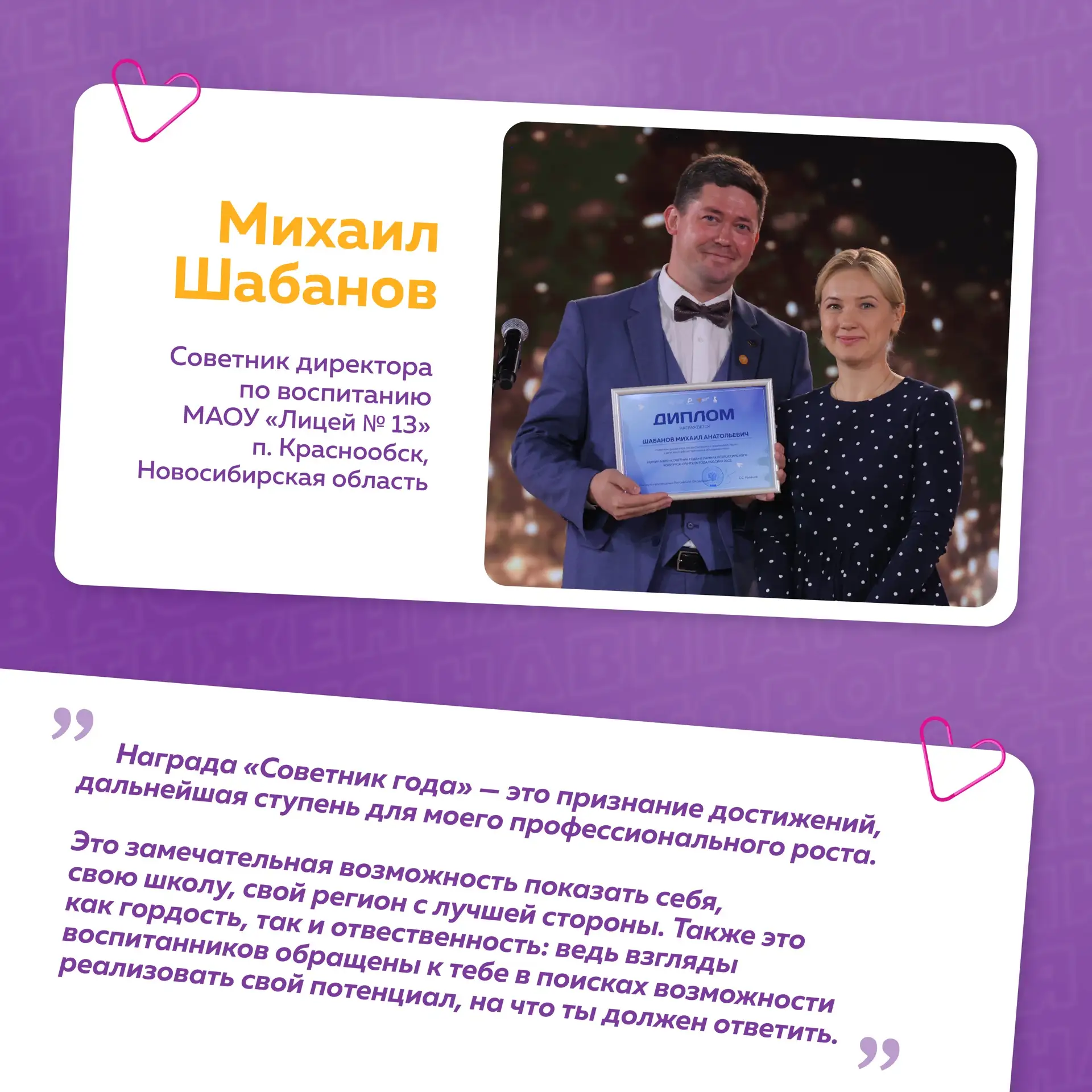 Победителем стал лауреат конкурса — Михаил Шабанов, советник директора по воспитанию Лицея № 13 посёлка Краснообск Новосибирской области.