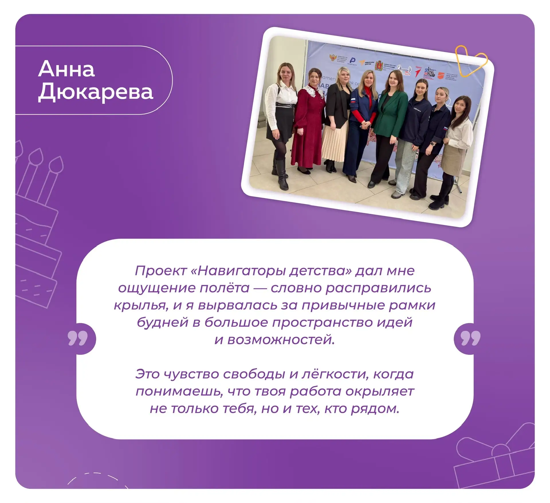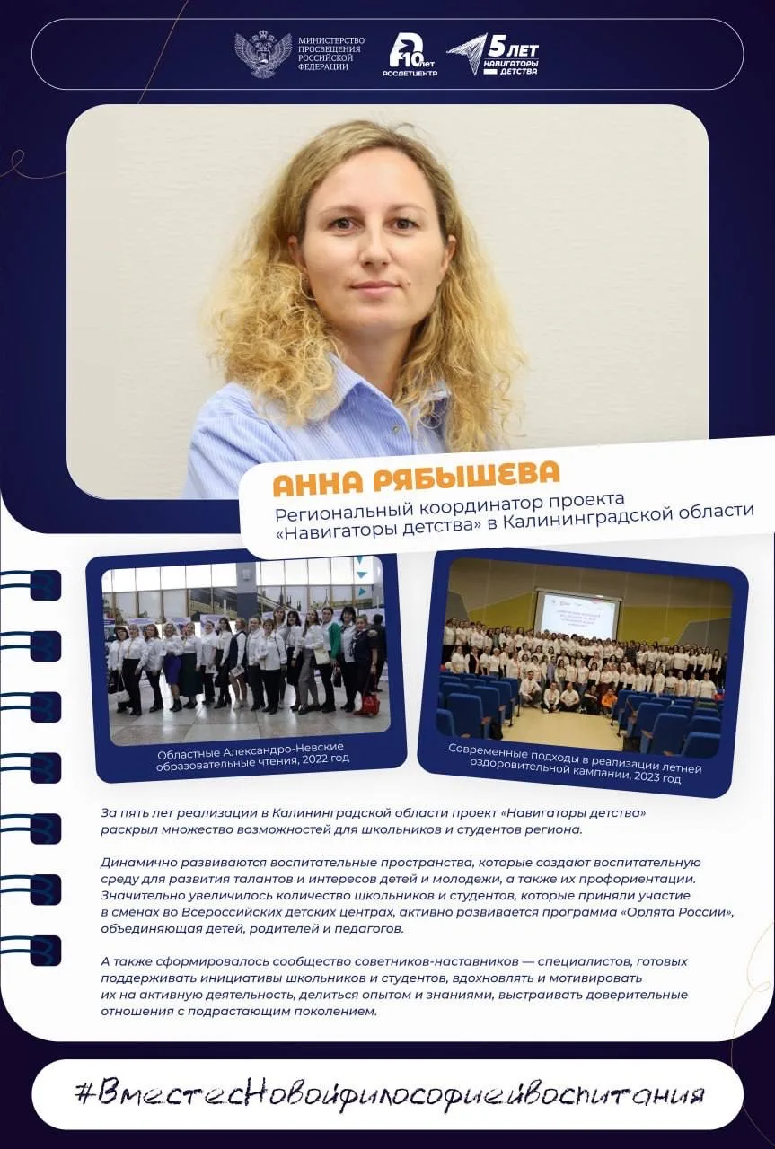 Мы благодарим вас за вклад в развитие проекта «Навигаторы детства» на территории региона, а также желаем, чтобы профессиональный путь всегда был освещён поддержкой надёжной команды единомышленников и каждый день радовал новой победой!