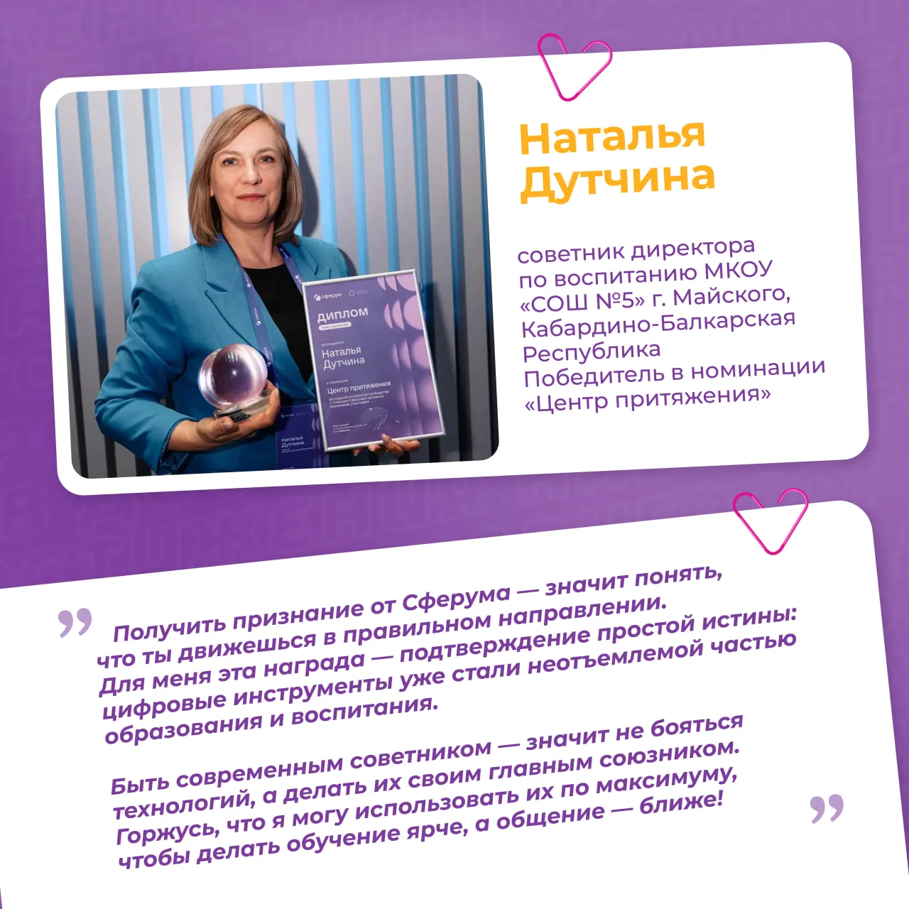 🔸 Наталья Дутчина, советник директора по воспитанию МКОУ «СОШ №5» г. Майского из Кабардино-Балкарской Республики, стала победителем в номинации «Центр притяжения».