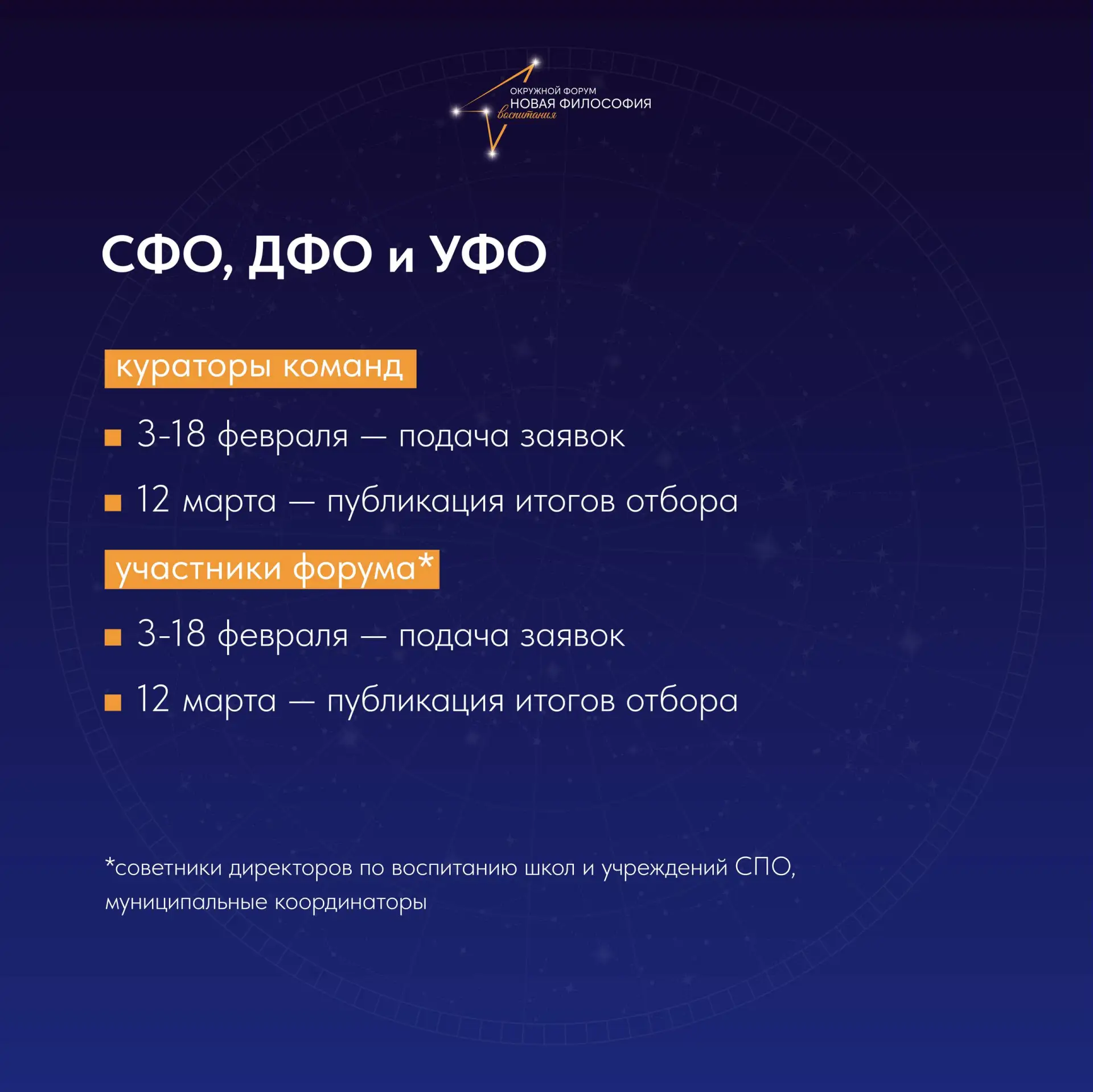 💫 Кураторами участников в рамках форумов могут стать советники директоров по воспитанию школ и учреждений СПО.
