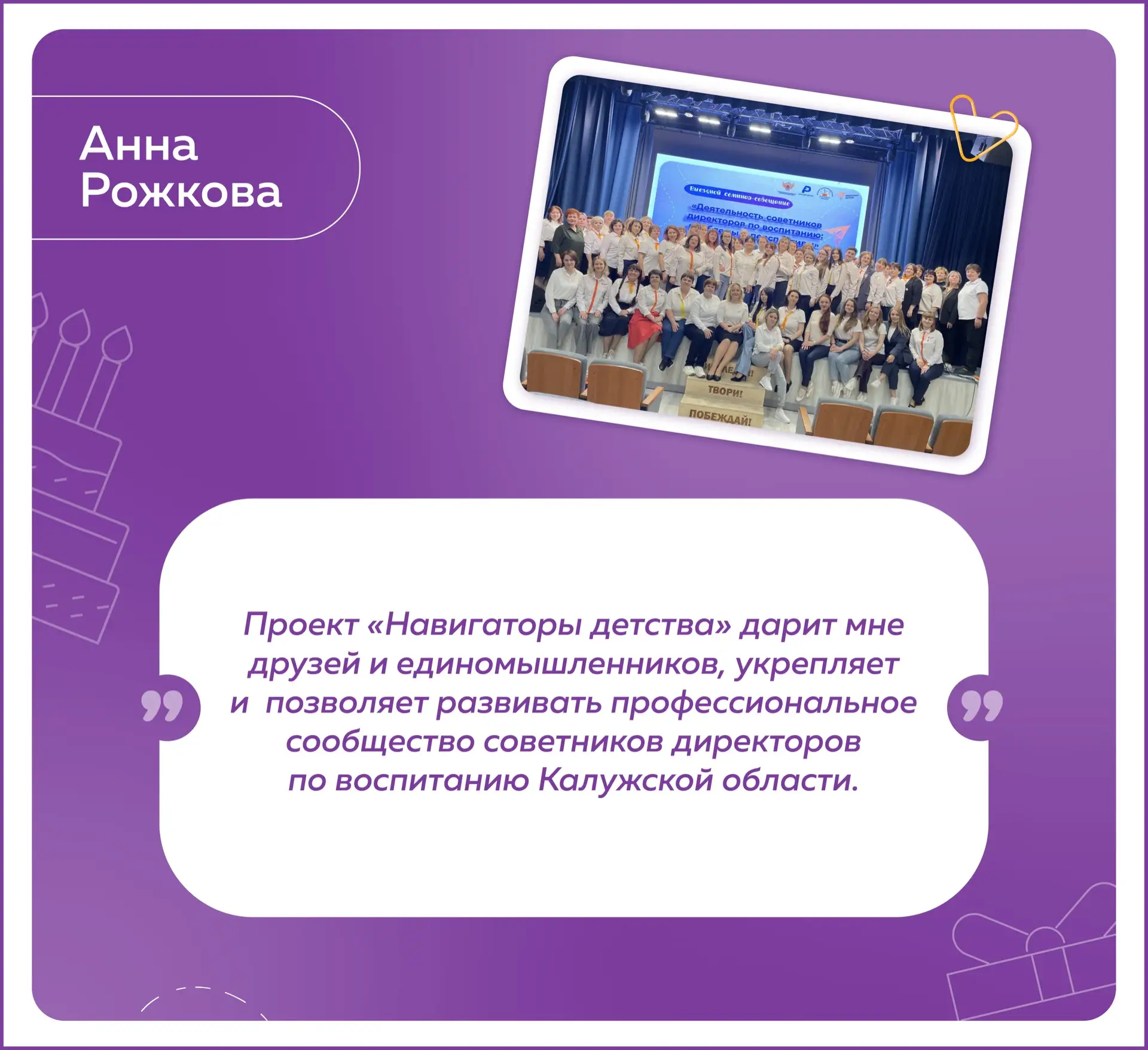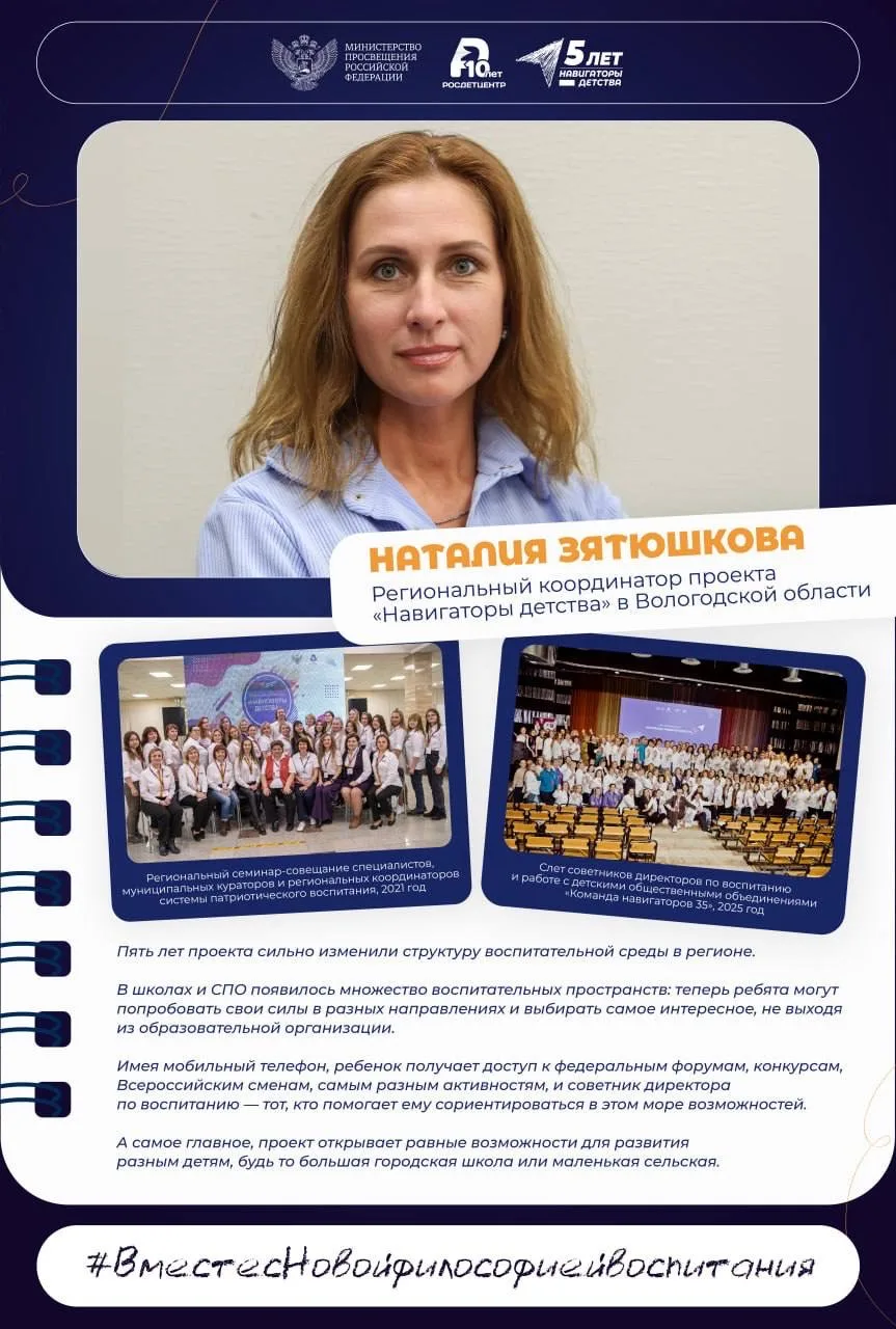 «Навигаторы детства» — это Всероссийская команда советников директоров по воспитанию и взаимодействию с детскими общественными объединениями, которая смотрит на воспитание по новому и работает с детьми по зову сердца.