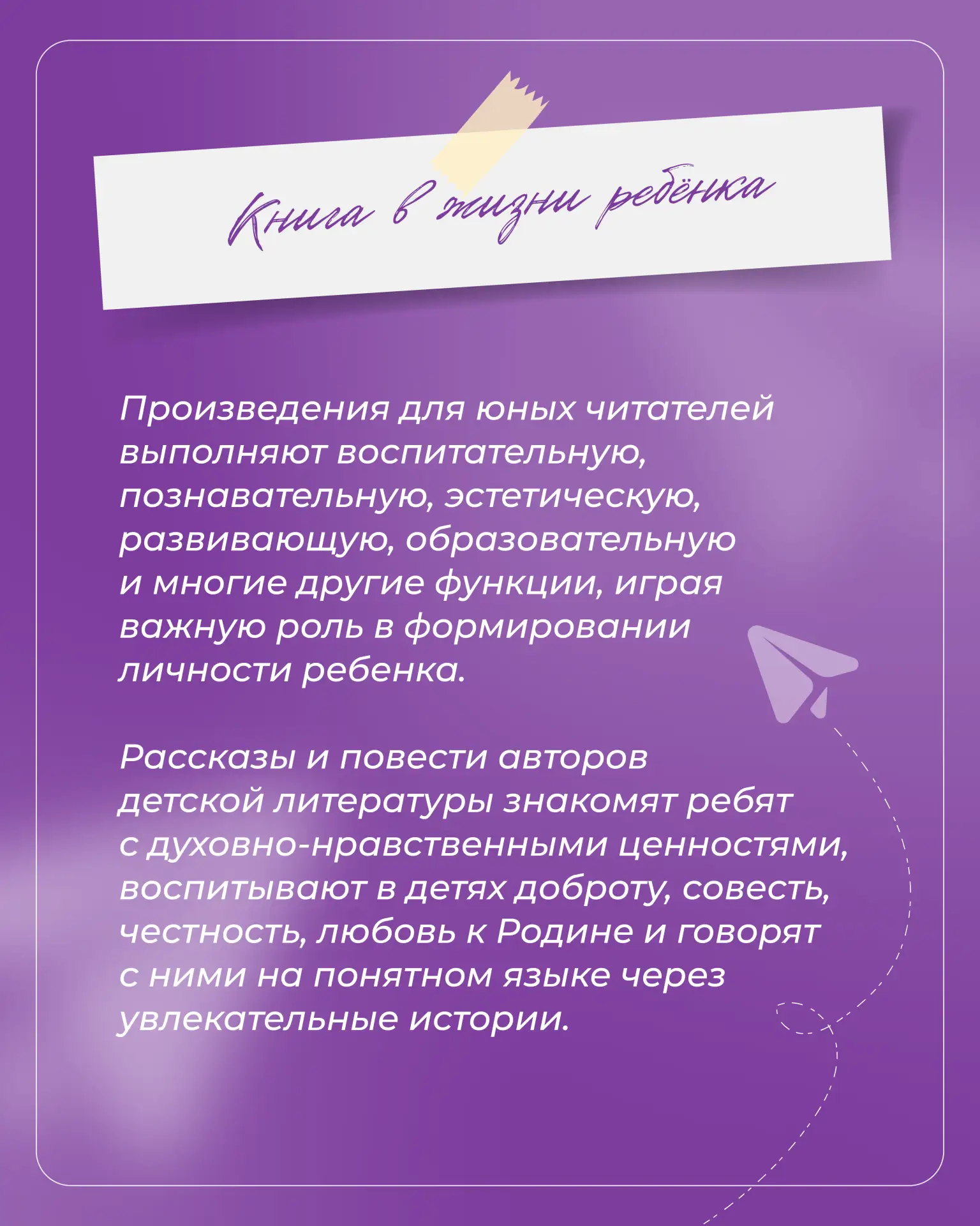 Книга становится для ребёнка проводником в мир ценностей, смыслов и открытий, помогает лучше понимать себя и окружающих.