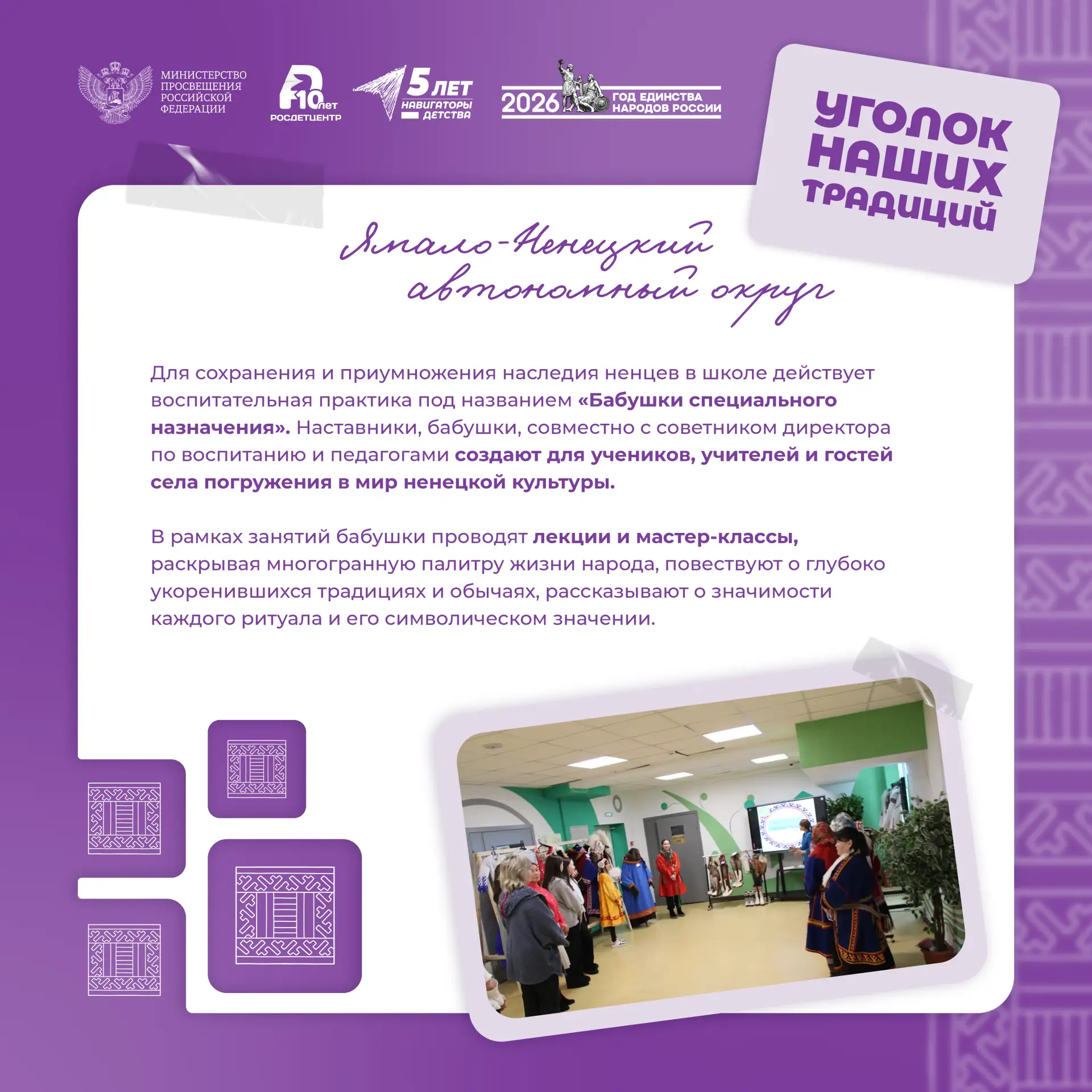 В 2026 году, помимо погружения в историко-культурное наследие городов и народов нашей большой страны, в рамках окружных форумов советники директоров по воспитанию школ и учреждений СПО посещают школы, колледжи и техникумы. На экскурсиях по образовательным организатором педагогические команды делятся с гостями практиками и опытом, рассказывают о реализованных инициативах и показывают, как выстроены и функционируют современные воспитательные пространства.
