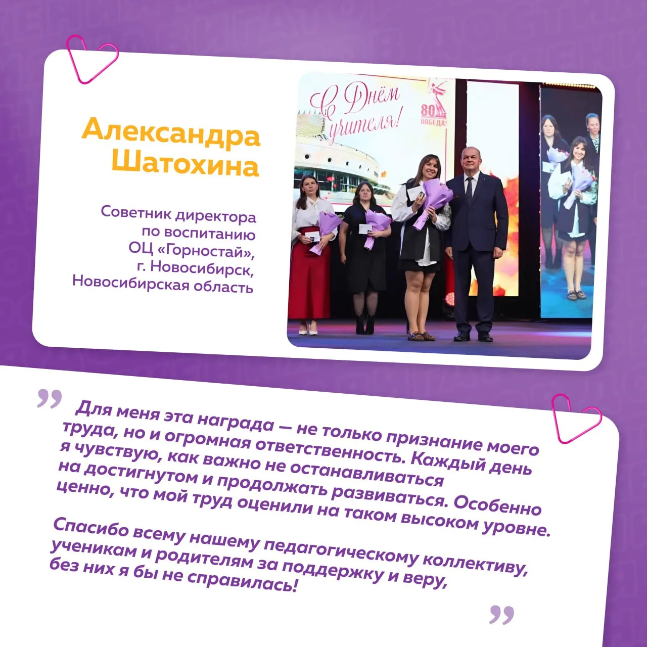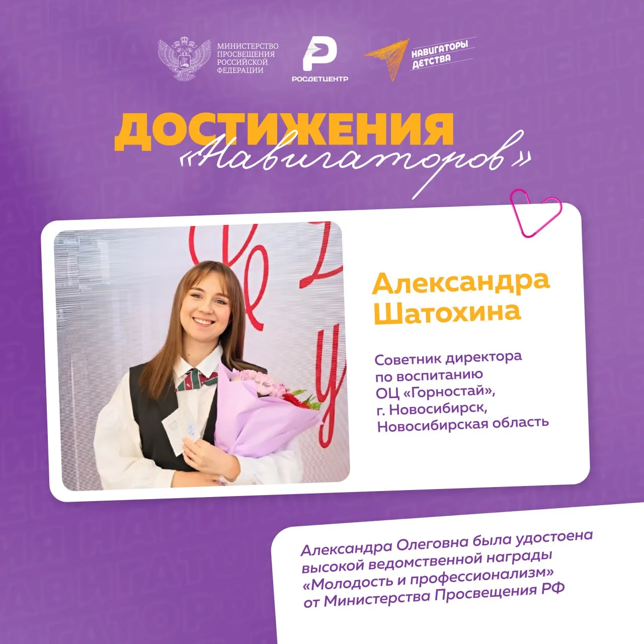 Александра Шатохина, советник директора по воспитанию образовательного центра «Горностай» из Новосибирской области была удостоена Нагрудного знака «Молодость и профессионализм» от Министерства Просвещения РФ.
