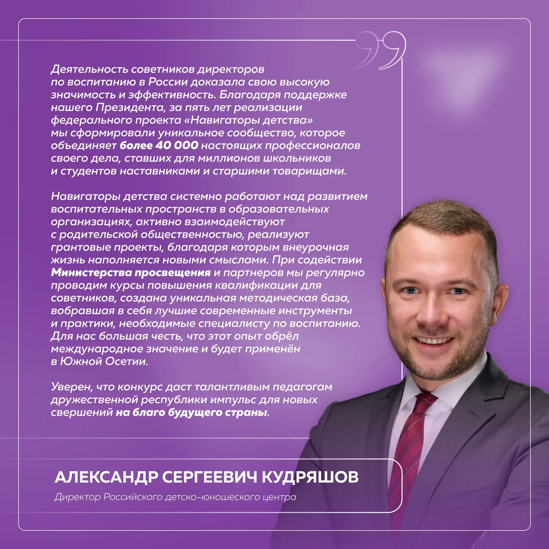 На Международной стратегической сессии «Формирование образа будущего системы воспитания Республики Южная Осетия» в Цхинвале Первый заместитель Руководителя Администрации Президента РФ Сергей Кириенко объявил о введении в школах Республики новой должности — советник директора по воспитанию.