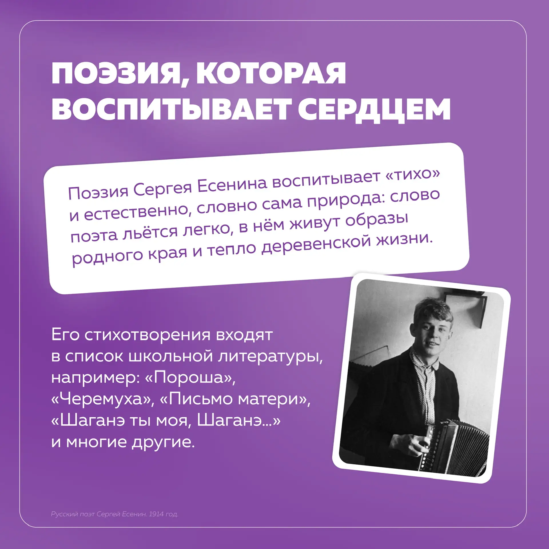 Его стихотворения нашли отклик в сердцах многих поколений. Произведения Сергея Есенина изучаются в школьной программе, знакомя детей с богатством русской поэзии, высокими чувствами и важными темами.