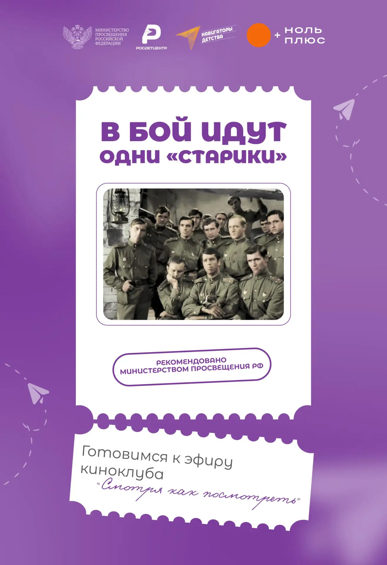 На трансляции эксперты кинопедагогики из кинотеатра «Ноль Плюс» вместе с секретным гостем обсудят художественный фильм «В бой идут одни "старики"» — классику, основой для которой стали подлинные события времен Великой Отечественной воины.