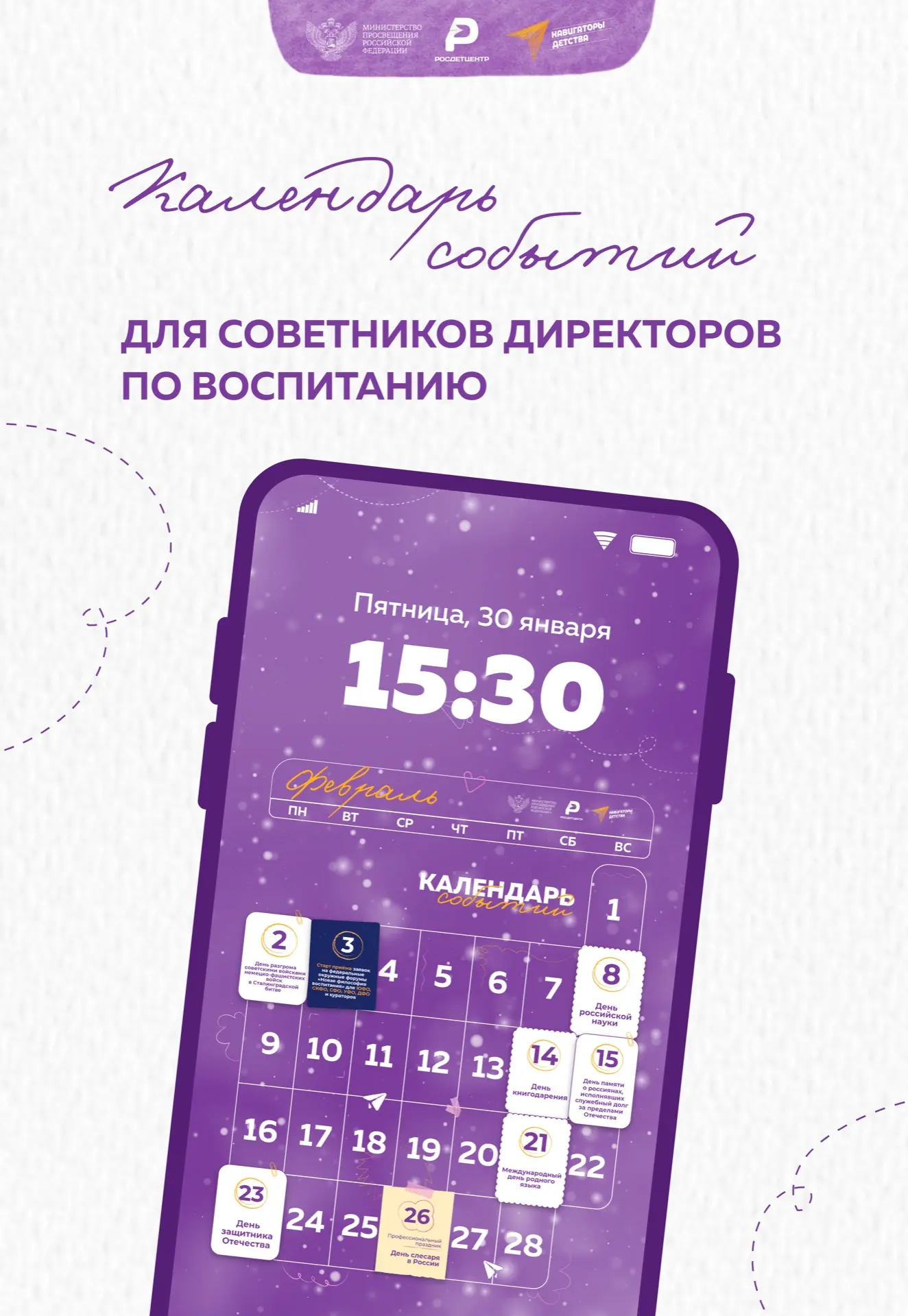 Первый рабочий месяц после новогодних праздников подходит к концу. И мы рады представить обновлённый календарь событий для советников директоров по воспитанию на февраль!