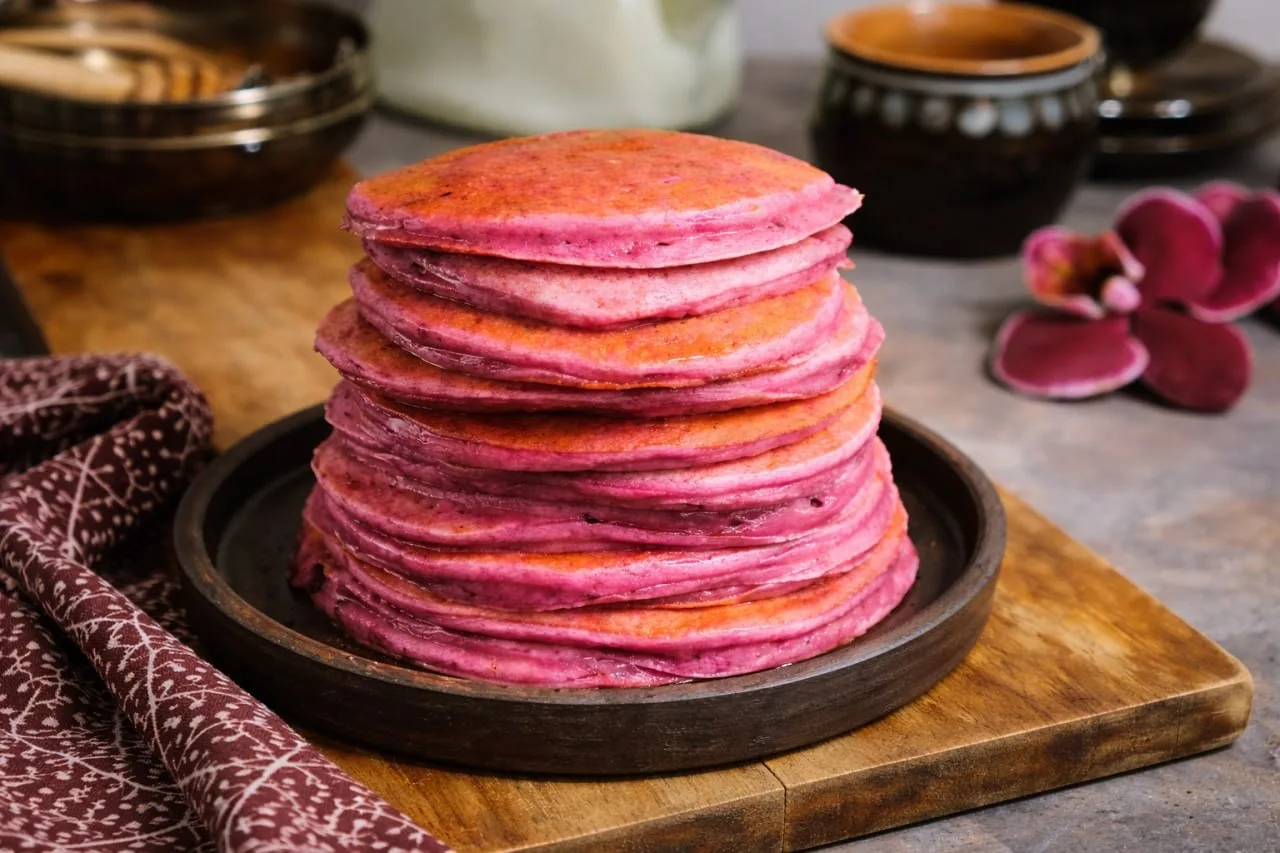 2️⃣ Тонкой струйкой влить кипяток, постоянно помешивая. Дать тесту постоять 5 минут и испечь блины.
