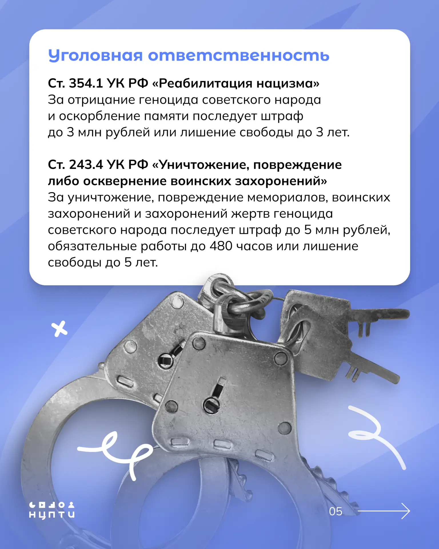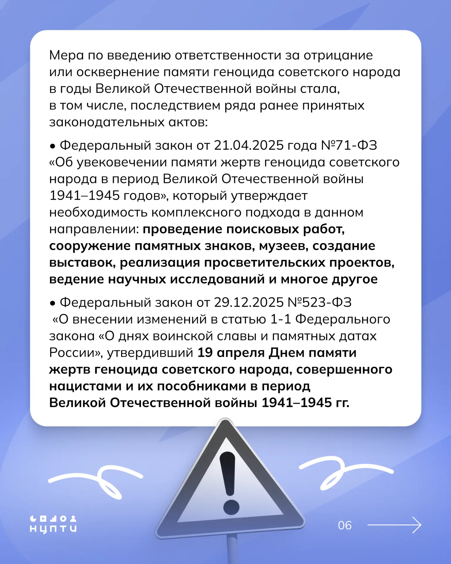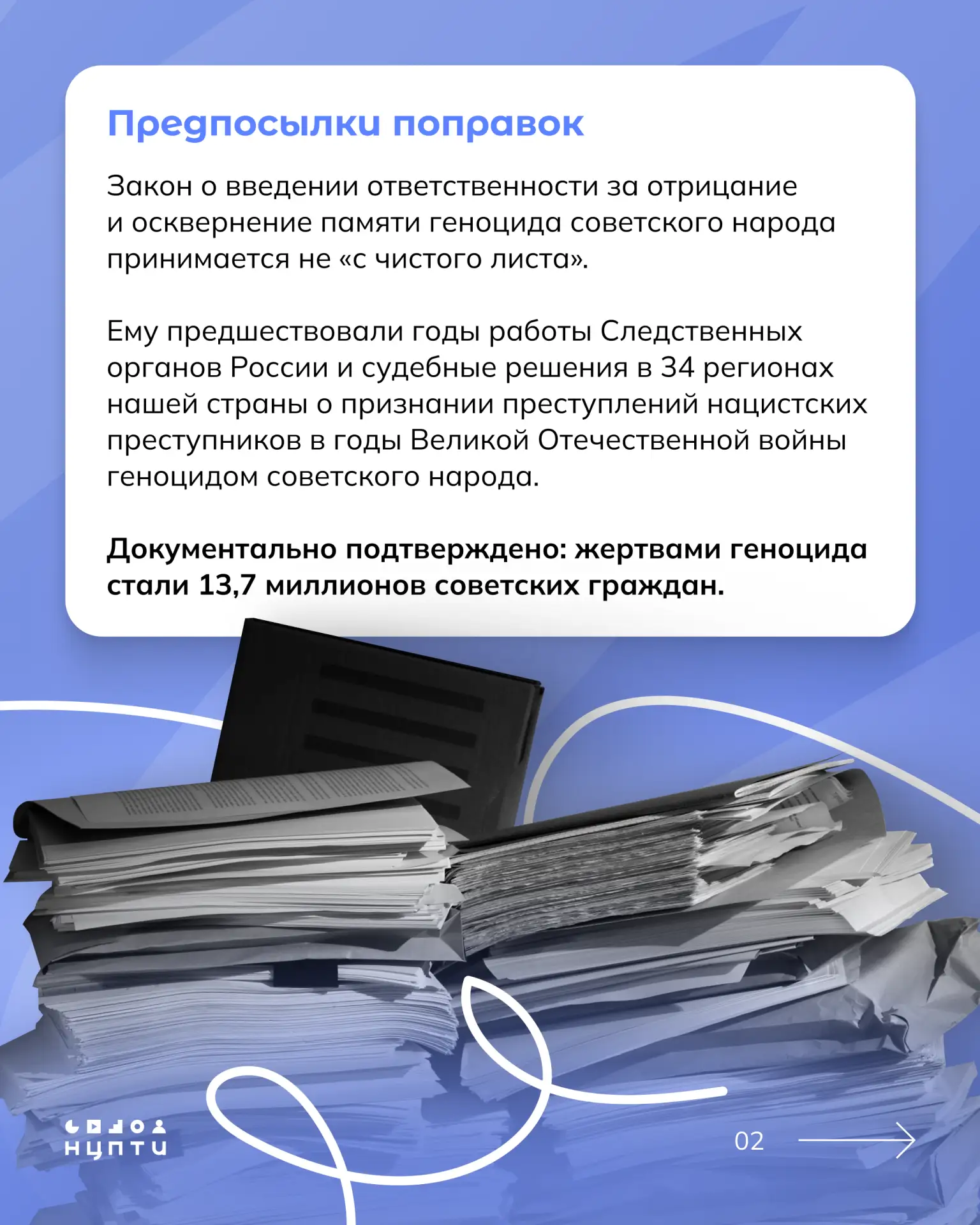 24 марта Государственная дума России приняла законопроект с поправками, предполагающими уголовное наказание за посягательство на историческую память и искажение правды о геноциде советского народа. Какая вводится ответственность и за какие действия — читайте в карточках.