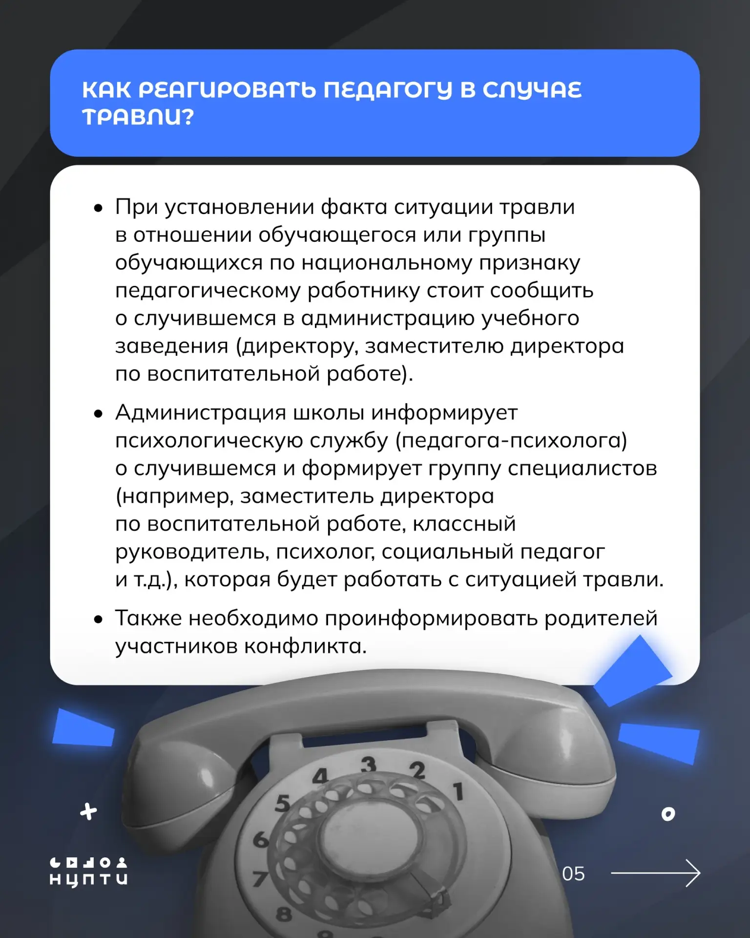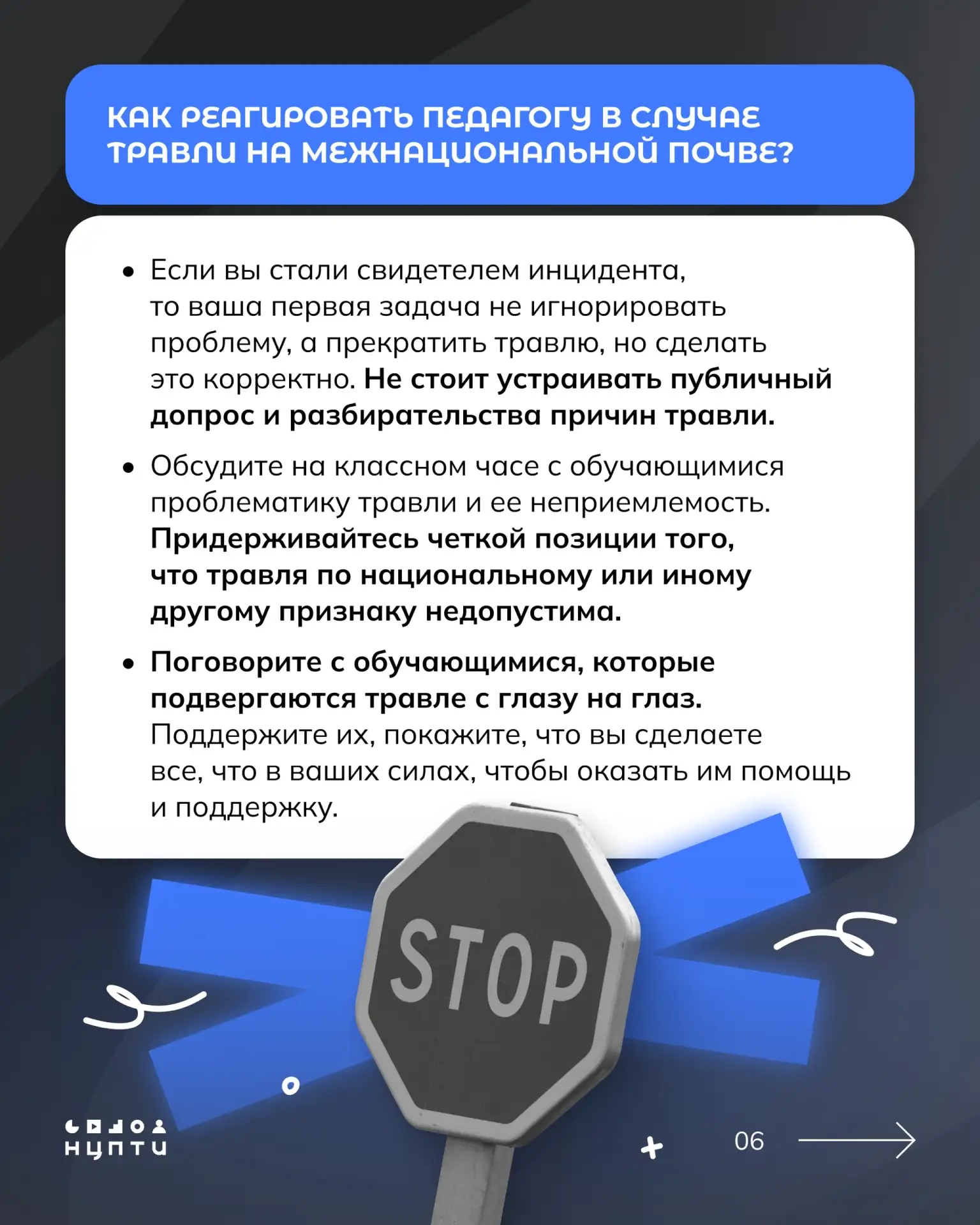 Собрали памятку, в которой отражены алгоритмы действий для преподавателя в случае травли. Прикрепили в посте ниже, а также опубликовали на сайте: нцпти.рф/материалы.