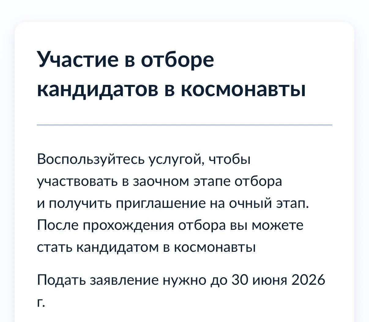 На «Госуслугах» открыли приём заявок на отбор в отряд космонавтов.
