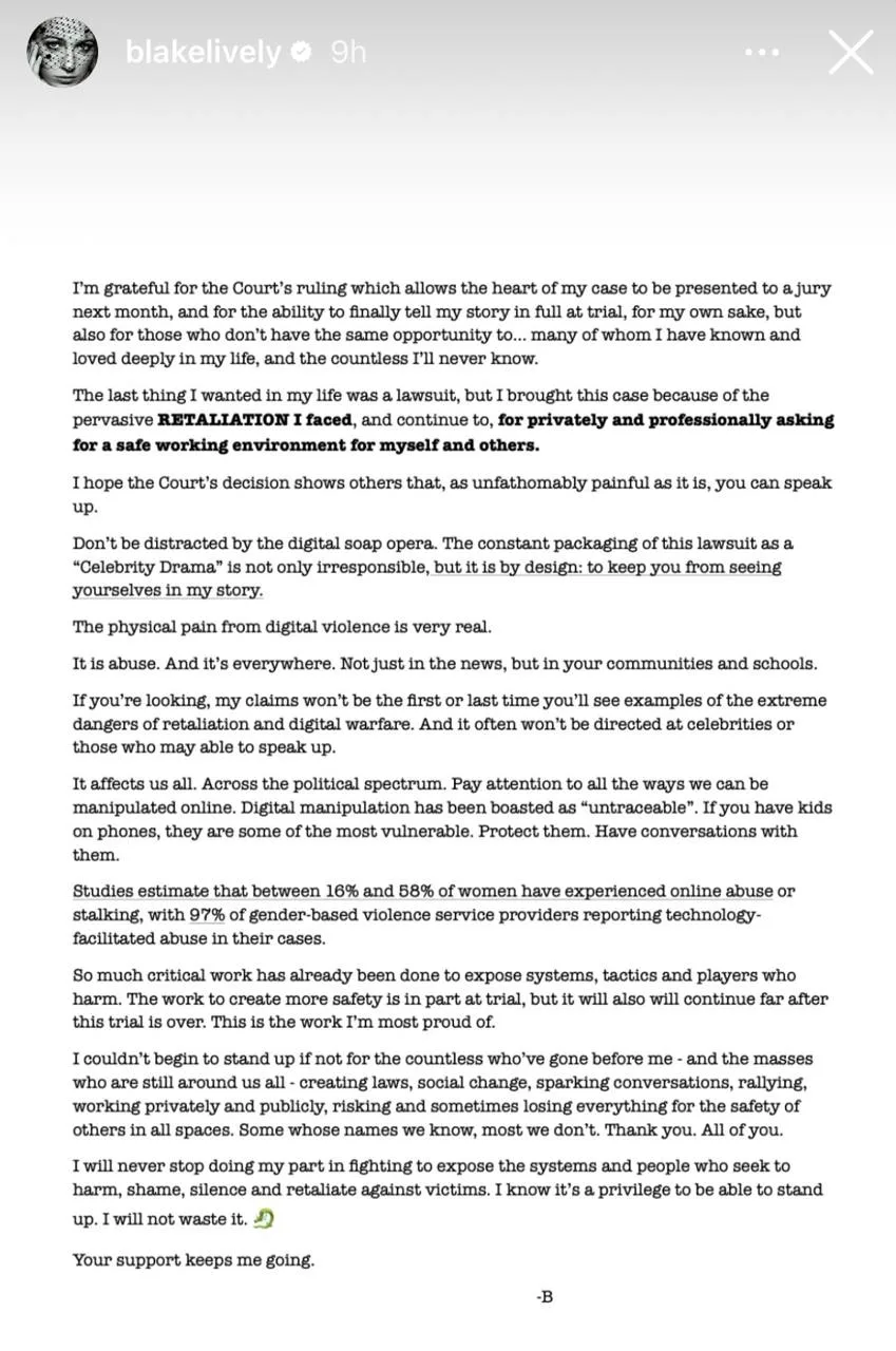 Напомню, в четверг суд отклонил иски Лайвли против Бальдони, включая клевету и домогательства.
