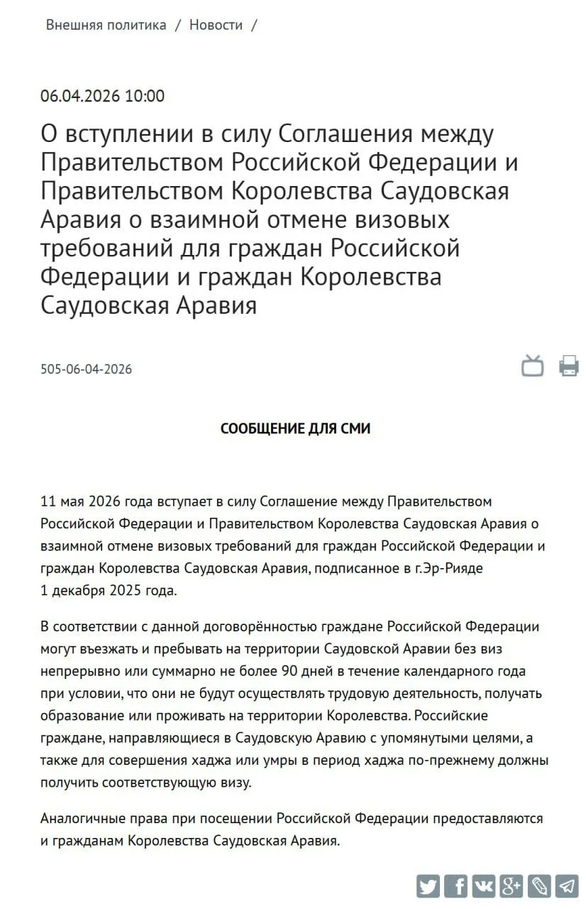 Россия и Саудовская Аравия вводят безвиз с 11 мая, сообщили в МИД РФ. Граждане России смогут въезжат в Саудовской Аравии без виз и пребывать там не более 90 дней в течение календарного года. Те же условия будут действовать и для граждан Саудовской Аравии при поездках в Россию.