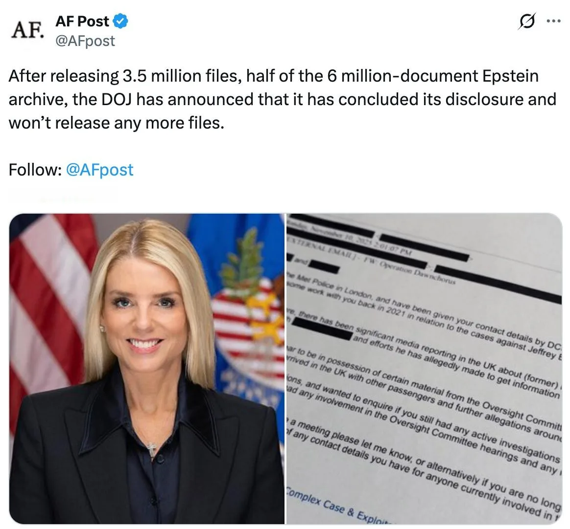 Минюст США объявил, что завершил публикацию материалов по делу Джеффри Эпштейна и больше новых документов раскрывать не будет, хотя из примерно 6 млн файлов обнародована лишь часть (около 3,5 млн страниц).