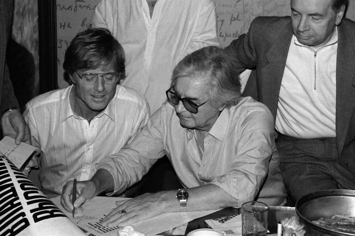 Редкий кадр: знаменитый американский актер Роберт Рэдфорд в кабинете легендарного режиссера Юрия Любимова, театр на Таганке. В кадре и поэт Андрей Вознесенский.