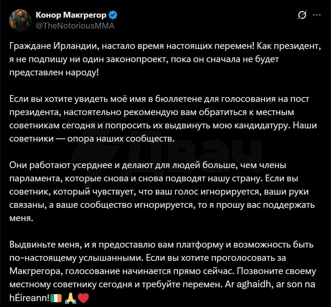 Конор Макгрегор все-таки баллотируется на пост президента Ирландии. Илон Маск уже оставил свой комментарий: «никто не будет сражаться за народ Ирландии упорнее, чем Конор Макгрегор!». Избиратели уже есть и они активны. Посмотрим, дойдут ли они до избирательных участков.