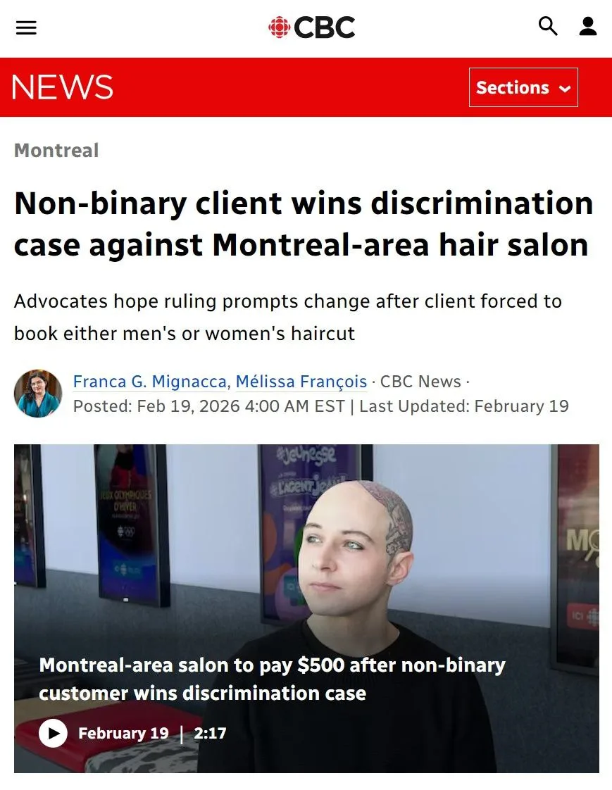 Парикмахерская из Монреаля выплатит денежную компенсацию небинарному клиенту, который подал на нее в суд за то, что салон предложил ему только мужские и женские стрижки, что нанесло потерпевшему душевную травму
