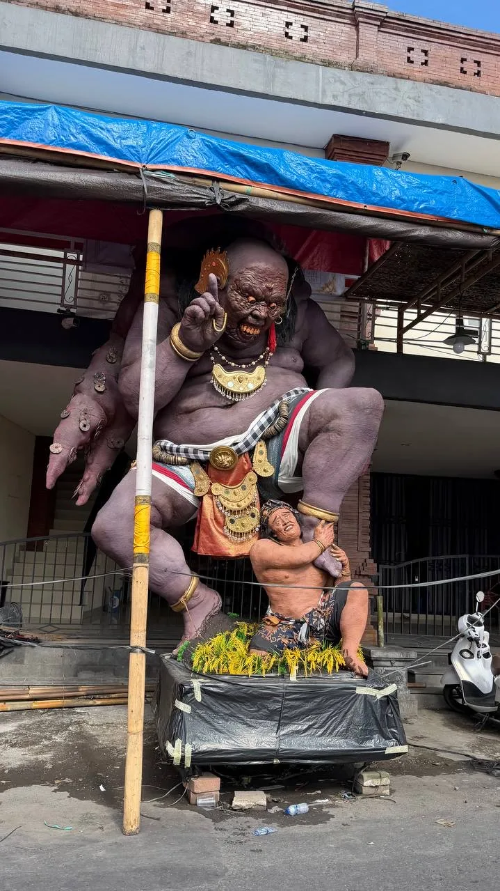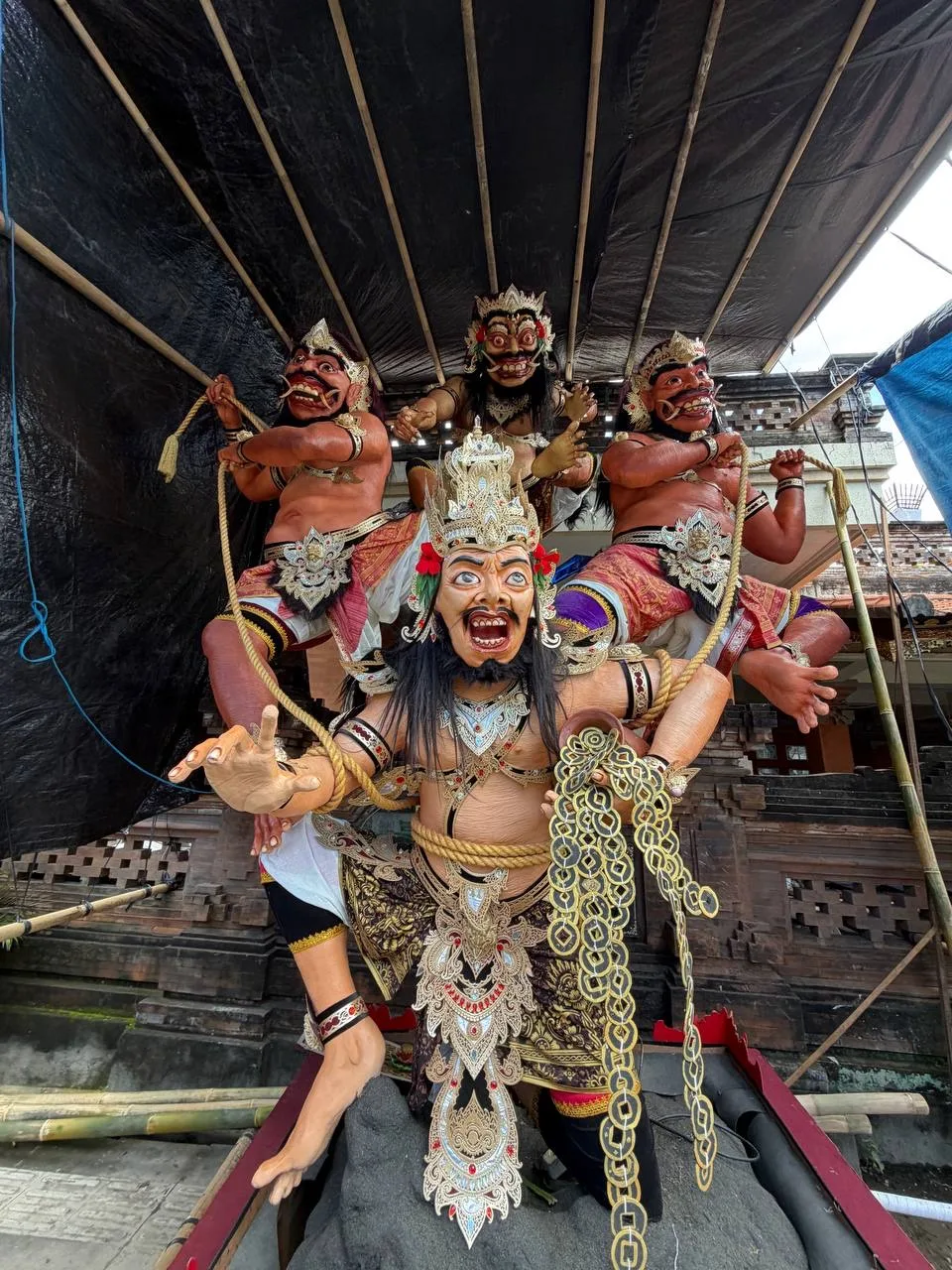 А перед этим проходит шумный парад с огромными демонами - огого (Ogoh-Ogoh). Демонов делают из папье-маше заблаговременно до парада вручную. И каждый год стараются сделать ещё более безумного и детализированного демона.