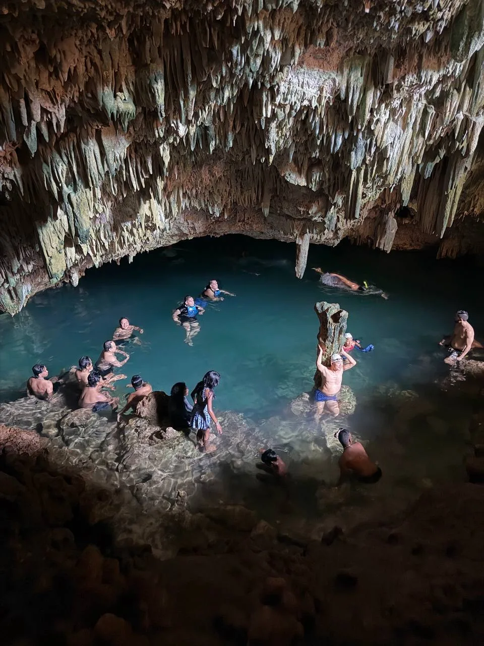 Мы заехали в Rangko Cave - пещера с морской водой внутри и мелкие летучие мыши. Место уникально тем, что в обед сюда приходит солнце и через маленький проход освещает водоем, делая его бирюзовым - ну, по крайней мере, так пишут различные источники. Добраться можно на такси/мопеде + 15-минутрная дорога на лодке. Сторожат пещеру обезьяны 😅