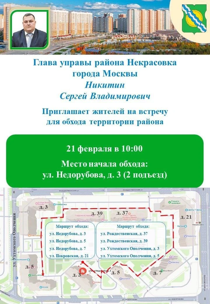 🗣Глава управы района Некрасовка Сергей Владимирович Никитин проведет еженедельный обход территории в субботу, 21 февраля.